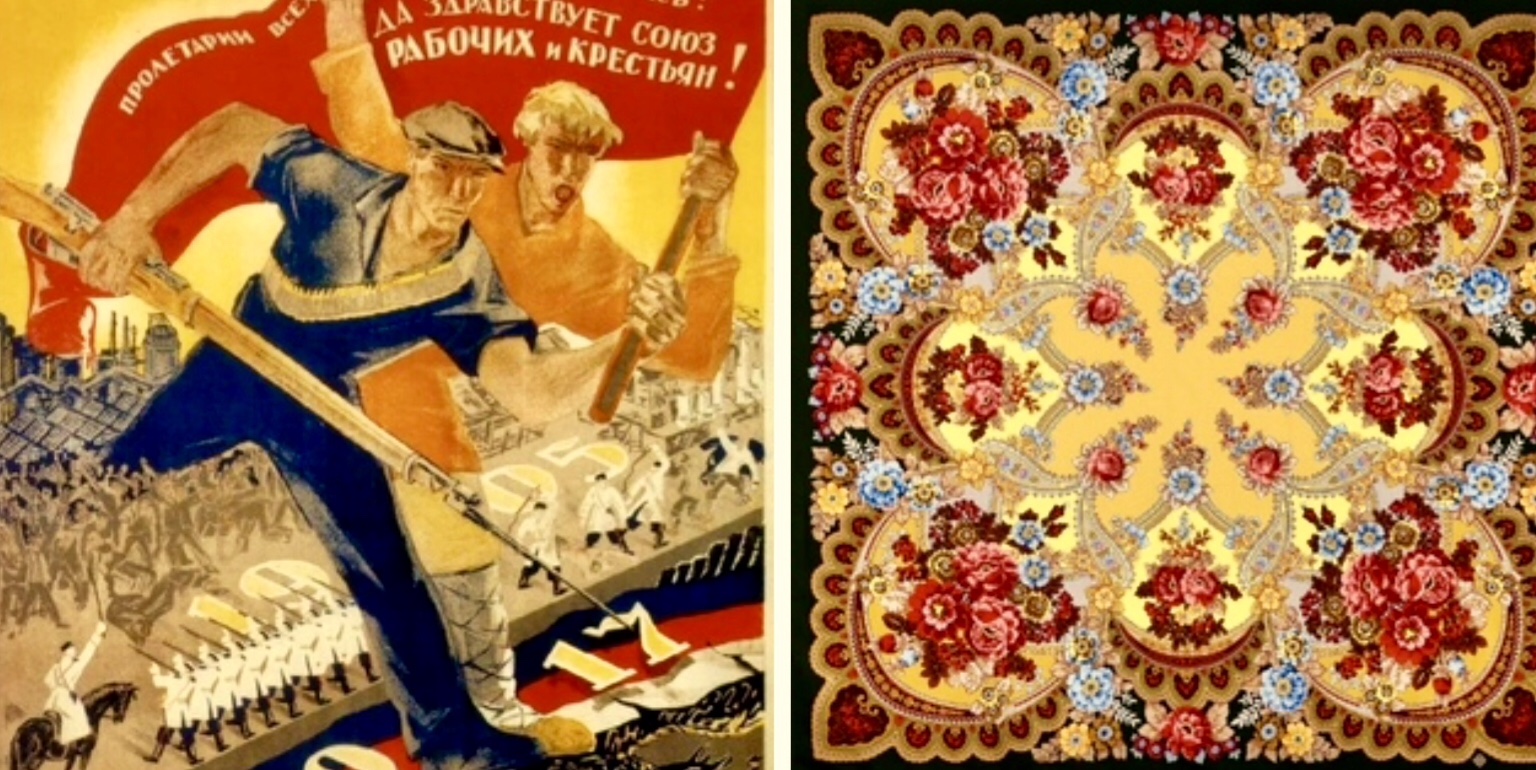 Читая стихотворение о Сухаревской, муж попросил переделать с платков на нейтральное, то есть без платочной темы. Он любит перекладывать на музыку разные такие тексты. Остальное в том стихотворении ему понравилось. Поэтому я новое написала уже без слов "платок", " шаль" и прочих. Зато нанизала много косвенных отсылок, особенно связанных с именем художницы, с материалом изделия (руно), с особенностями рисунка (сцена, знамена, пышные гроздья всего как доминанта оформительской советской стилистики) и т.д. Немножко поиграла в преемника Пимена ("пыль веков от хартий отряхнув... "). Но этот текст мужу не зашёл совершенно. Это, конечно, не цель главная была, просто болтаю.