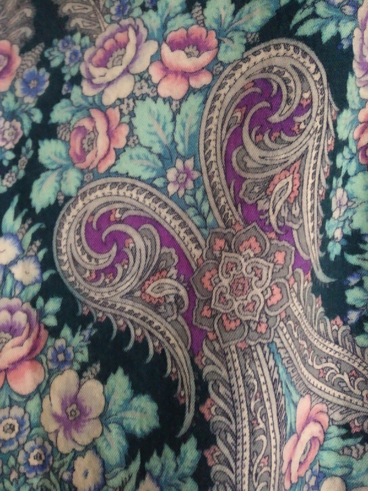 Дорогие Сударыни! Обращаюсь за помощью клуба. Шаль я опознала, конечно, но вот такого колорита я не видела. Встретилась она мне на Вернисаже в Измайлово. Сразу скажу, что на фейк не похожа. Полноценная шерстяная шаль с плетеной бахромой. Кайма и середина очень темно зеленого цвета. Видимо постирана. Цвета как бы припыленные. Можно сделать скидку на полинялость. Но фиолетовые медальоны и темно зеленый грунт вроде бы не встречался. Кто знает, видел, поделитесь.