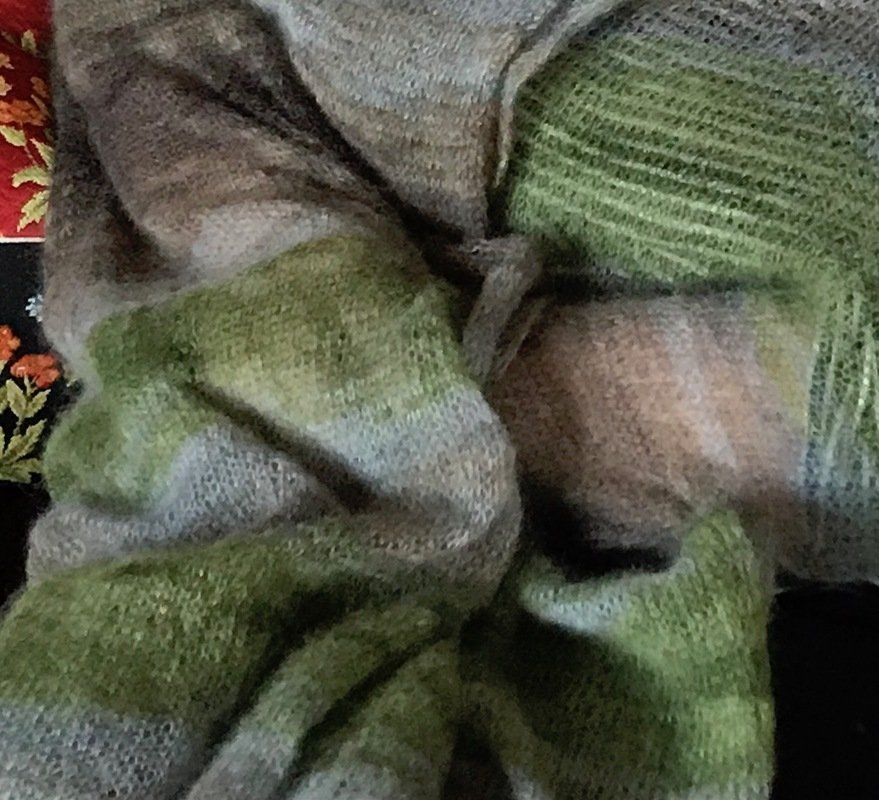 Мохер очень понравился составом--(мохер -шелк). Прекрасно драпируется, невесомый. Пробовала на разных спицах-на 6 -ке лучше всего, хоть и "дыры" большие поначалу, потом полотно распушивается и заполняет частично эти дыры. При этом очень тепло. Широкая мохеровая юбка( на подкладе разумеется) миди, обычной лицевой гладью, из Принтового мохера (серо-зеленый) Лана Гросса смотрелась отпадно.