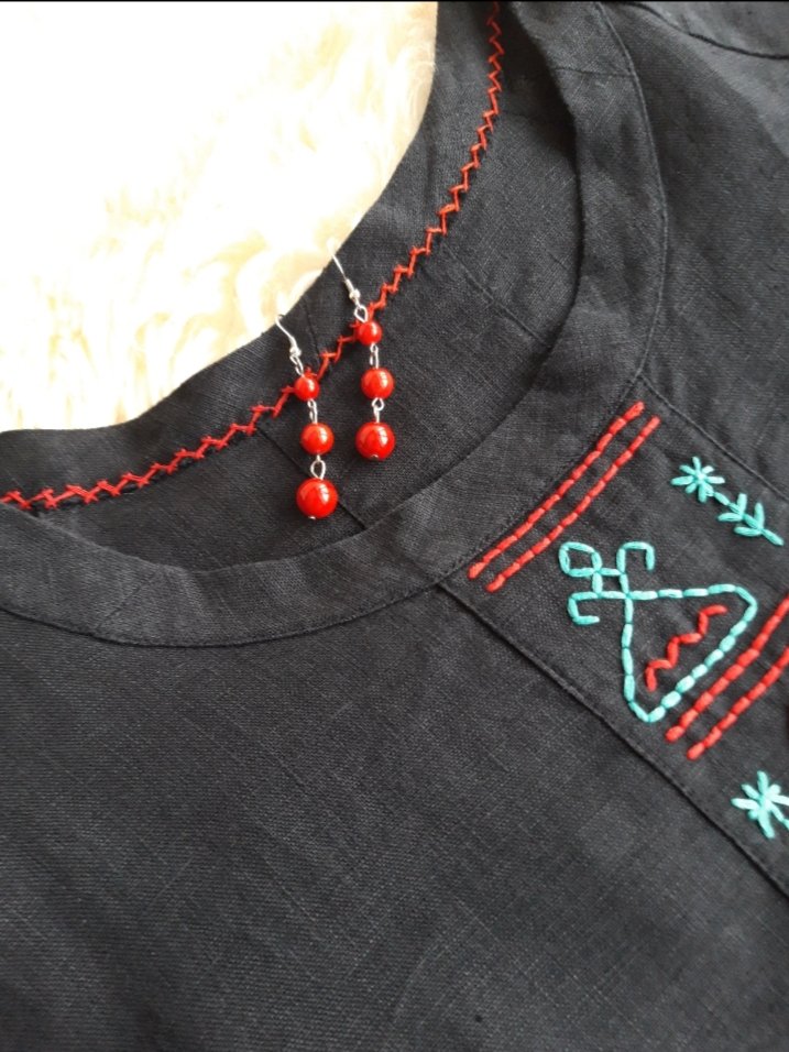 Я очень ценю удобство в одежде, особенно в верхней части, с детства не выношу жестких плечей, узких пройм, дущащих воротников - поэтому крой прямой, рукав реглан, пройма углубленная, вырез открывает ключичную ямку. Под вышитой планкой сборка, которая дает дополнительный обьем в нижней части. Рукав 3/4, локоть уже в "фонарике", это очень удобно в динамике. С изнанки вышивка закрыта второй планкой, никаких торчащих ниток)) Планку горловины с изнанки не подгибала, лен плотный грубо бы получилось - открытый срез подшила вручную, козликом, теми же нитками, что и вышивала. Получилось вполне изюмисто :D