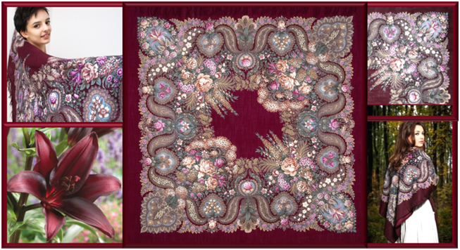 Лилию можно встретить в платках «Над серебряной водой Сухаревской Татьяны и «Первое свидание» Зиновьевой Клары.