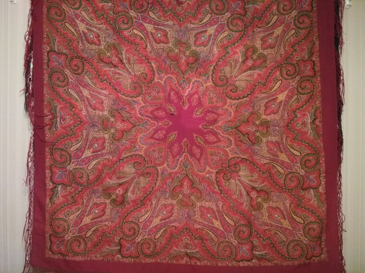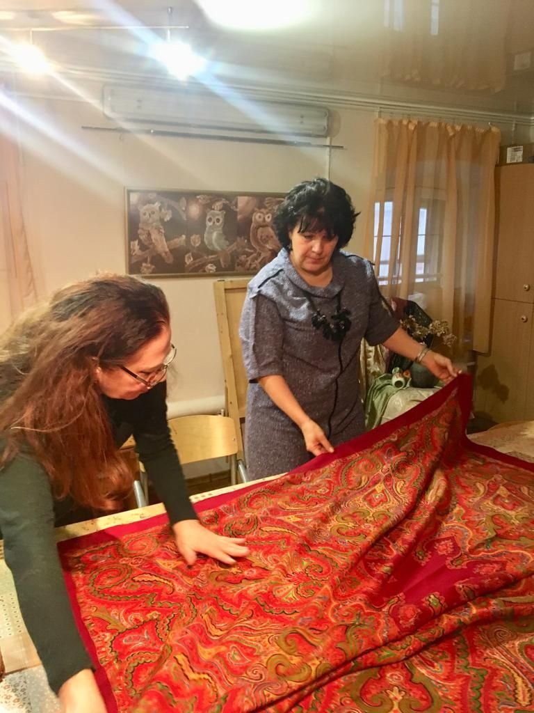 По уже сложившейся традиции взяла с собой несколько старинных шалей, появившихся у меня в прошлом году благодаря нашим украинским подругам. Среди привезённых оказалась шаль из коллекции восстановленных ППМ в конце 50-х гг. в технике ручной набойки старинных орнаментальных восточных узоров (таких, как уже известные "Золотой петушок", "Восточная птица" и другие)