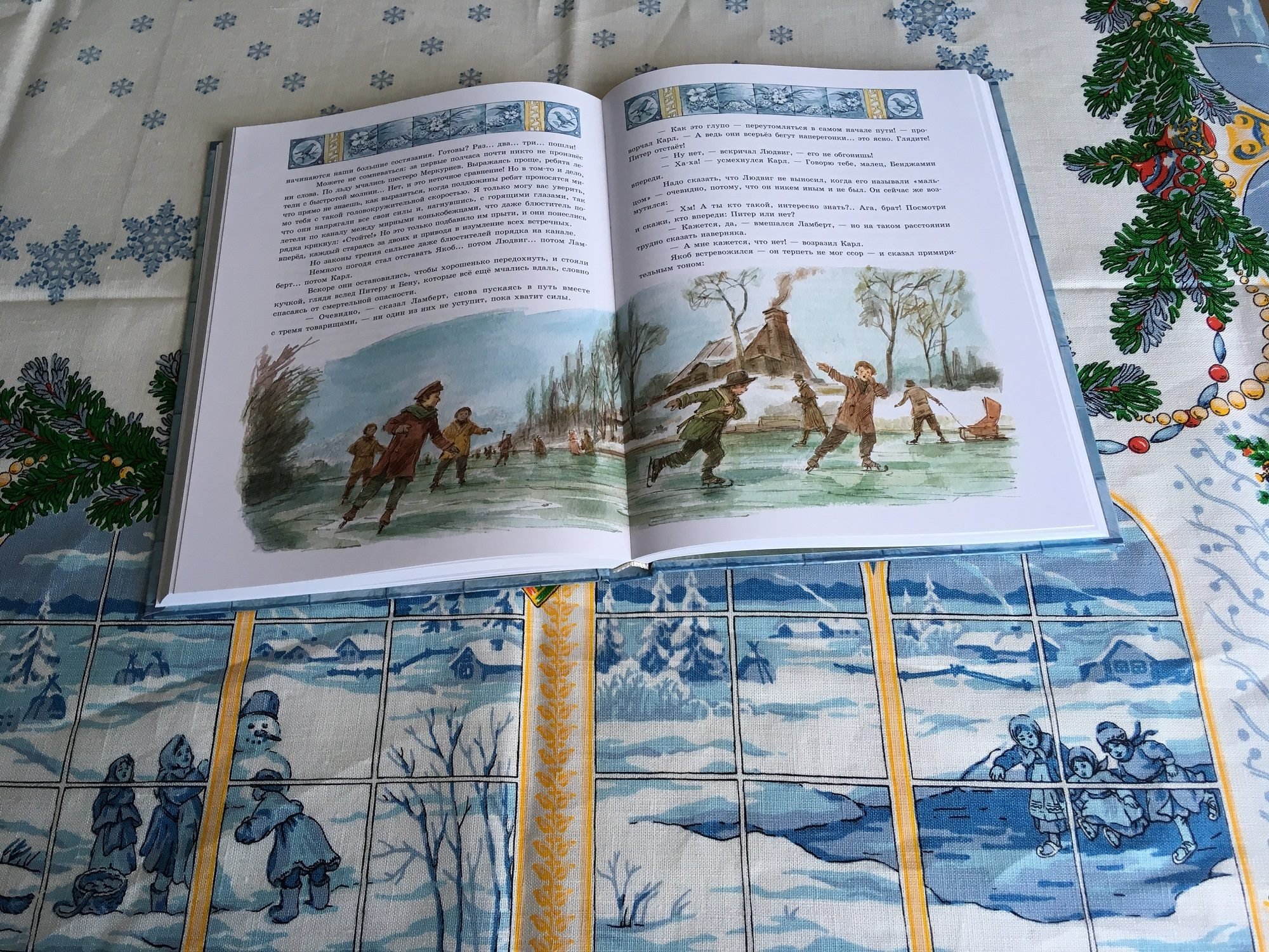 Вот с этими голубыми окошками-изразцами книжки и перекликаются сценки и пейзажи в оконцах скатерти. И там, и там зимние забавы, катание на коньках, Рождество, подарки, дети и детство.