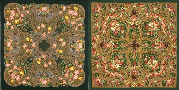 3. Посмотрите на этот мини-букет из листьев: на верхнем платке он зеленый и четко выделяется, а на нижнем почти слился с фоновым рисунком, кажется, что это фон и есть: