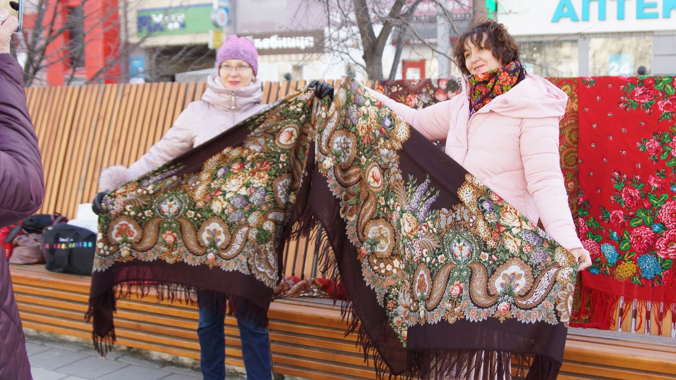 Элегия и Четыре праздника- старинки впечатляют. Все-таки на новых платках тонкая прорисовка делает их акварельными, а вот старинки- мощные мазки масляной краски, особенно Маки. И на голове Оксане хорошо, хотя как на мой вкус старинки лучше раскрываются внакидку.