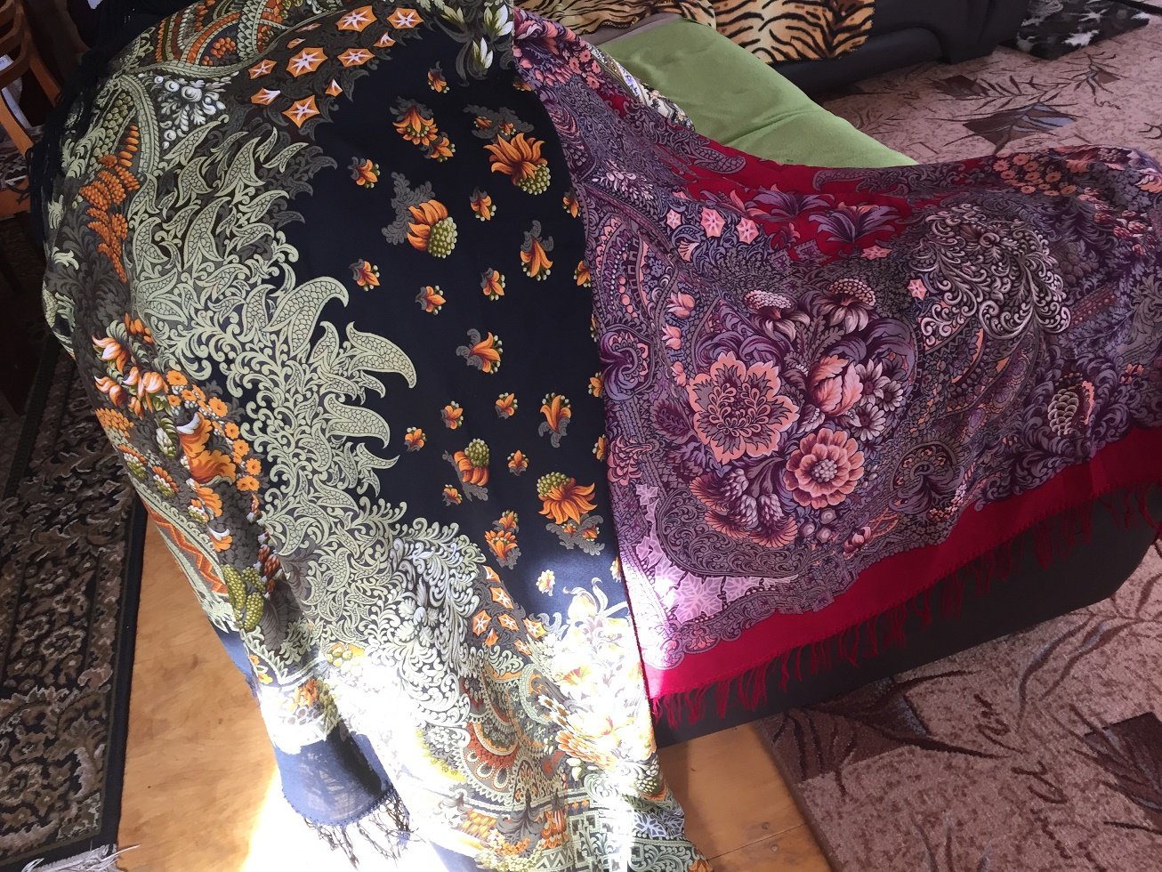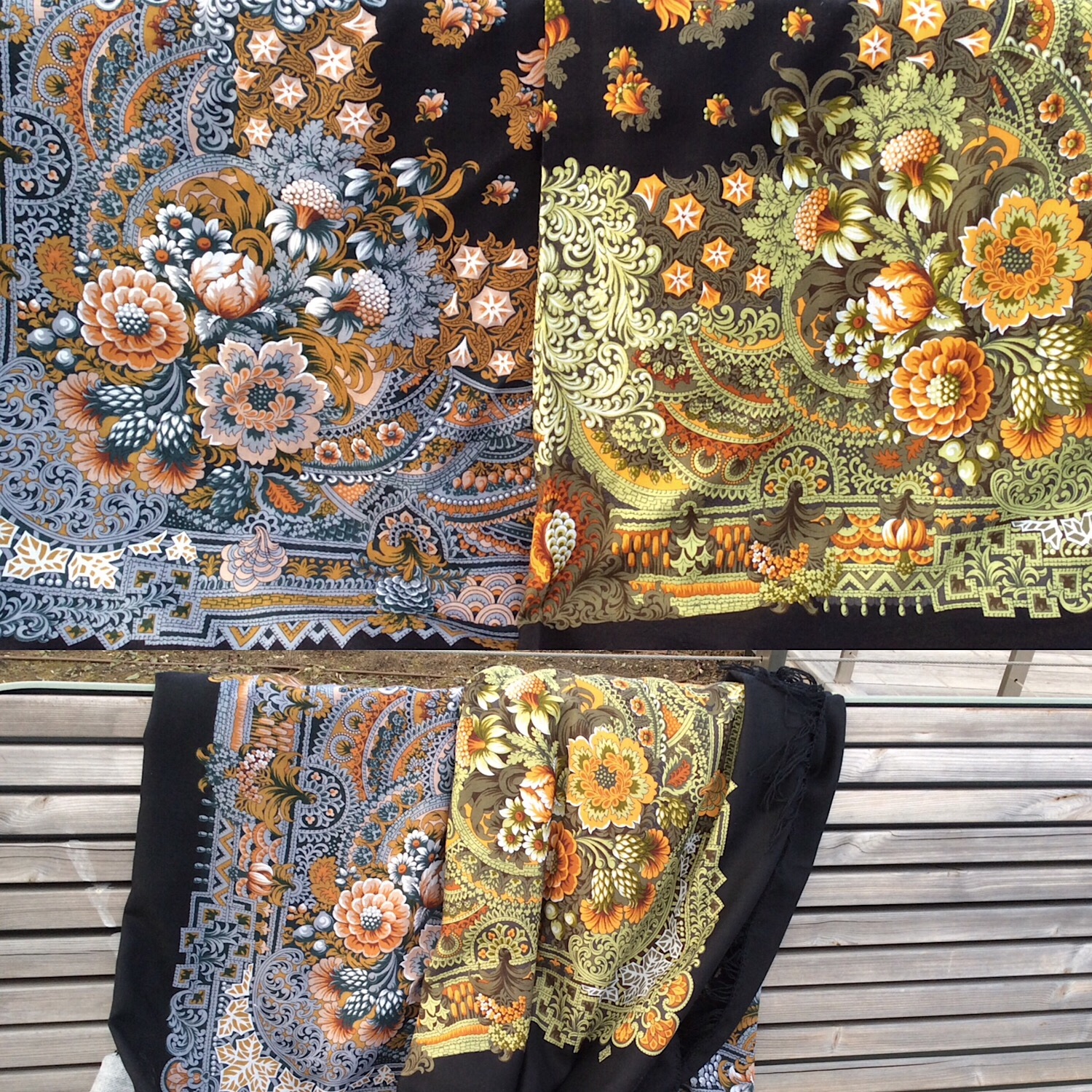 А вот ещё два шедевра, полученных сегодня! Тоже сравниваю: по красоте и росписи. Шикарная "Планета цветов" художника Натальи Белокур и "Жостовский букет" художника Шолоховой Татьяны. Оба платка без сомнения- произведение искусства.