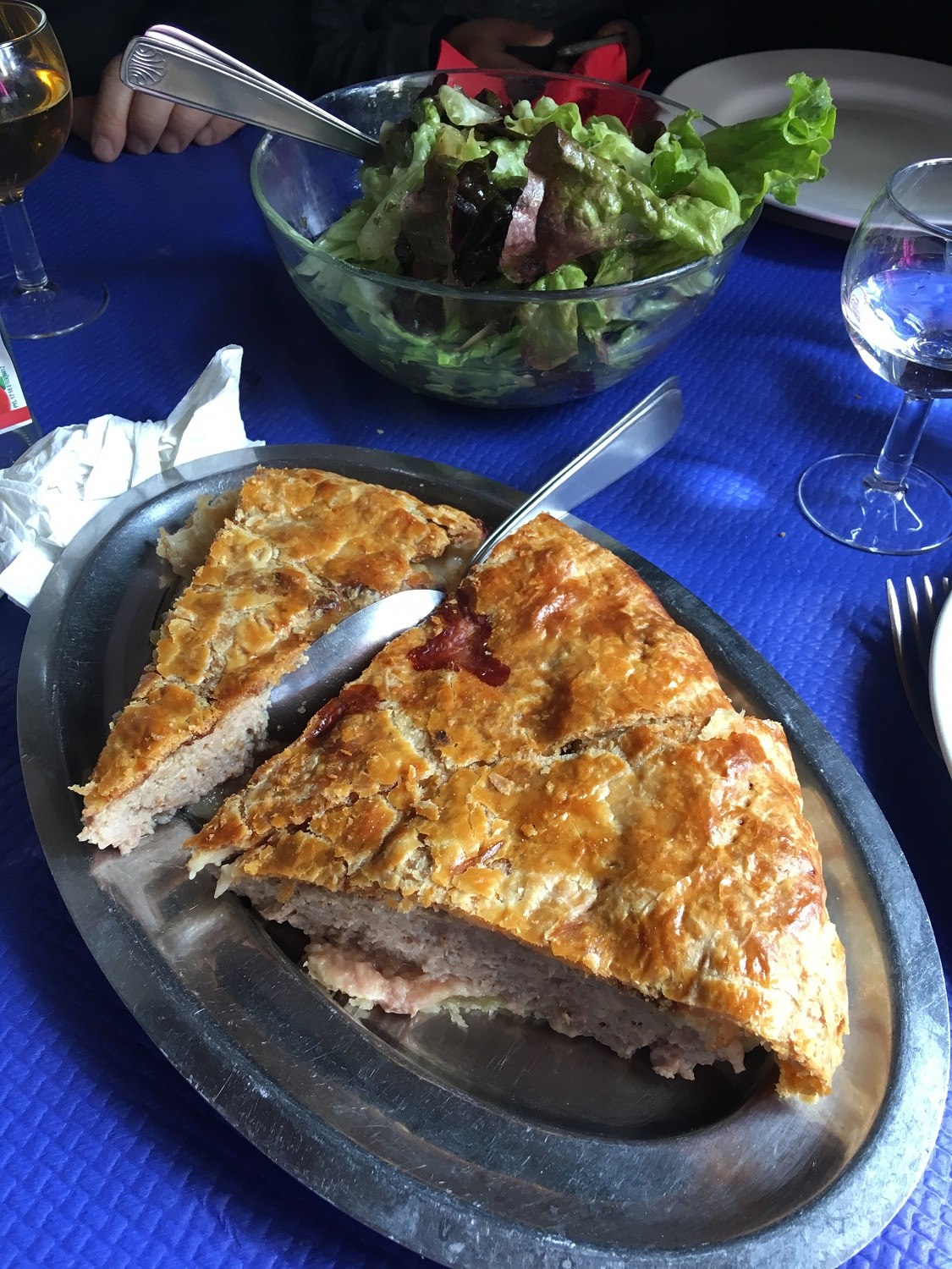 Хороший признак – короткое меню и карта вин. Эльзасская кухня простая и сытная: протертый овощной суп в глиняном горшке, tourte (пирог из слоеного теста с мясом) с зеленым салатом, жареная толченая картошка с копченой свининой и салатом, на десерт кофе, домашнее мороженое с черникой, пирог с ревенем, натуральный яблочный сок, вода.