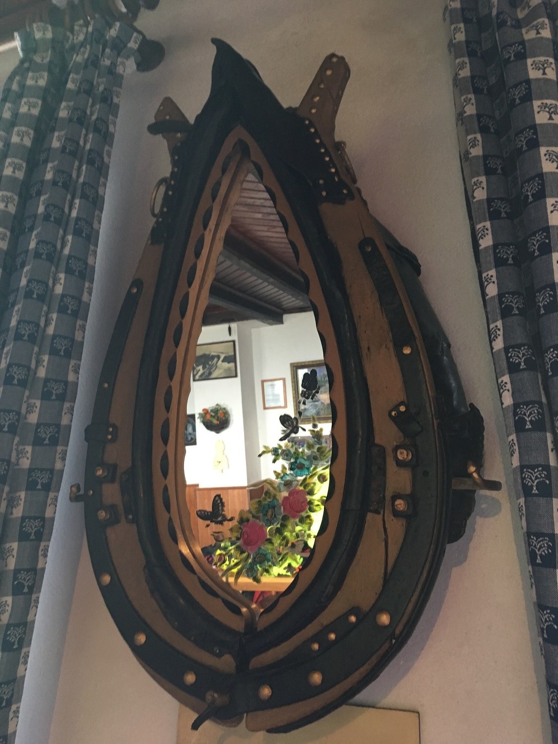Интерьер типичный, простой и уютный, деревянные лавки, коровьи колокольчики (я бы сказала, больше смахивающие на колокола) на широких кожаных ремнях, сухие букетики, расписные бидоны, седла, прочие предметы крестьянского быта, медная кухонная утварь, старые фото этих мест.