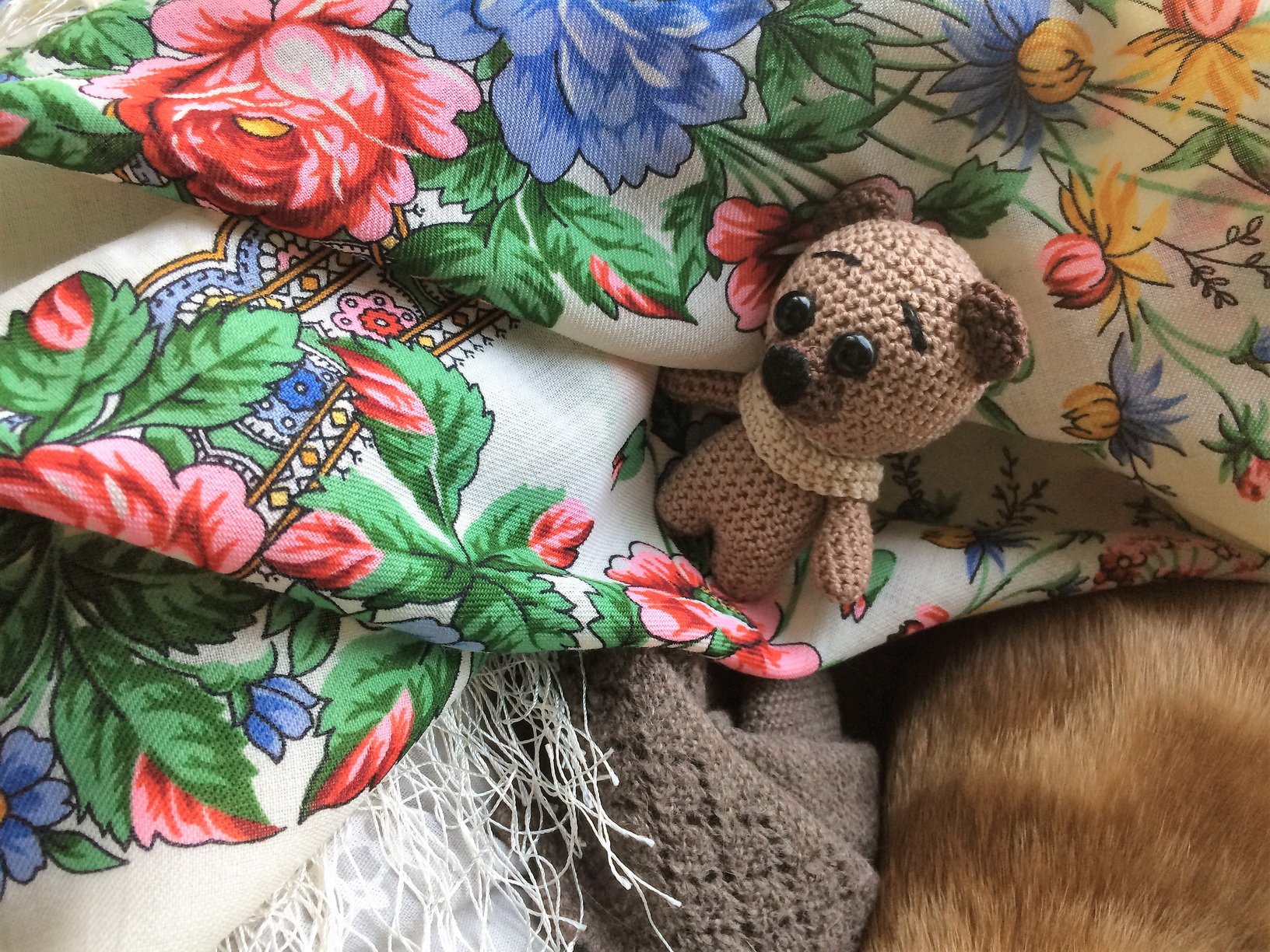 Зарина, как здорово мы совпали в нежных белопольных платках на начало апреля. И стихи правильные. А кто это такой оранжевый и вязаный? Очень мил и улыбчив.