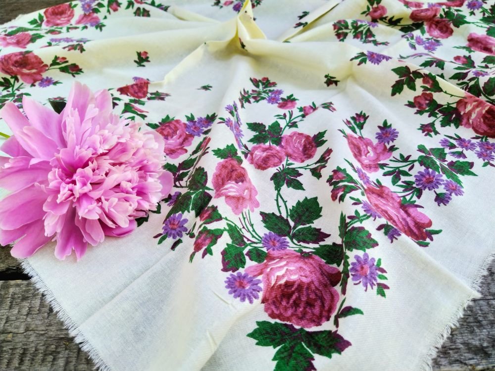 Здравствуйте. Я решила показать фотографии моего "найденыша". Это платочек 84х84 см из чудесного хлопка, тактильно почти бархатный, мягкий и чуть шершавый. Принадлежал бабушке моего мужа (Кликните, чтобы почитать, что спрятано под катом).... Думаю, привет из 70-х. Мне чудится рука Клары Зиновьевой. Может быть Вам знаком этот рисунок?