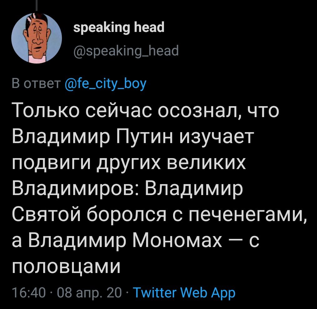 В своей речи 2003 года кроме печенегов и половцев он ещё псов-рыцарей вспоминал и Великую Отечественную. В должности премьера... Видео в интернете есть, сюжет НТВ.
