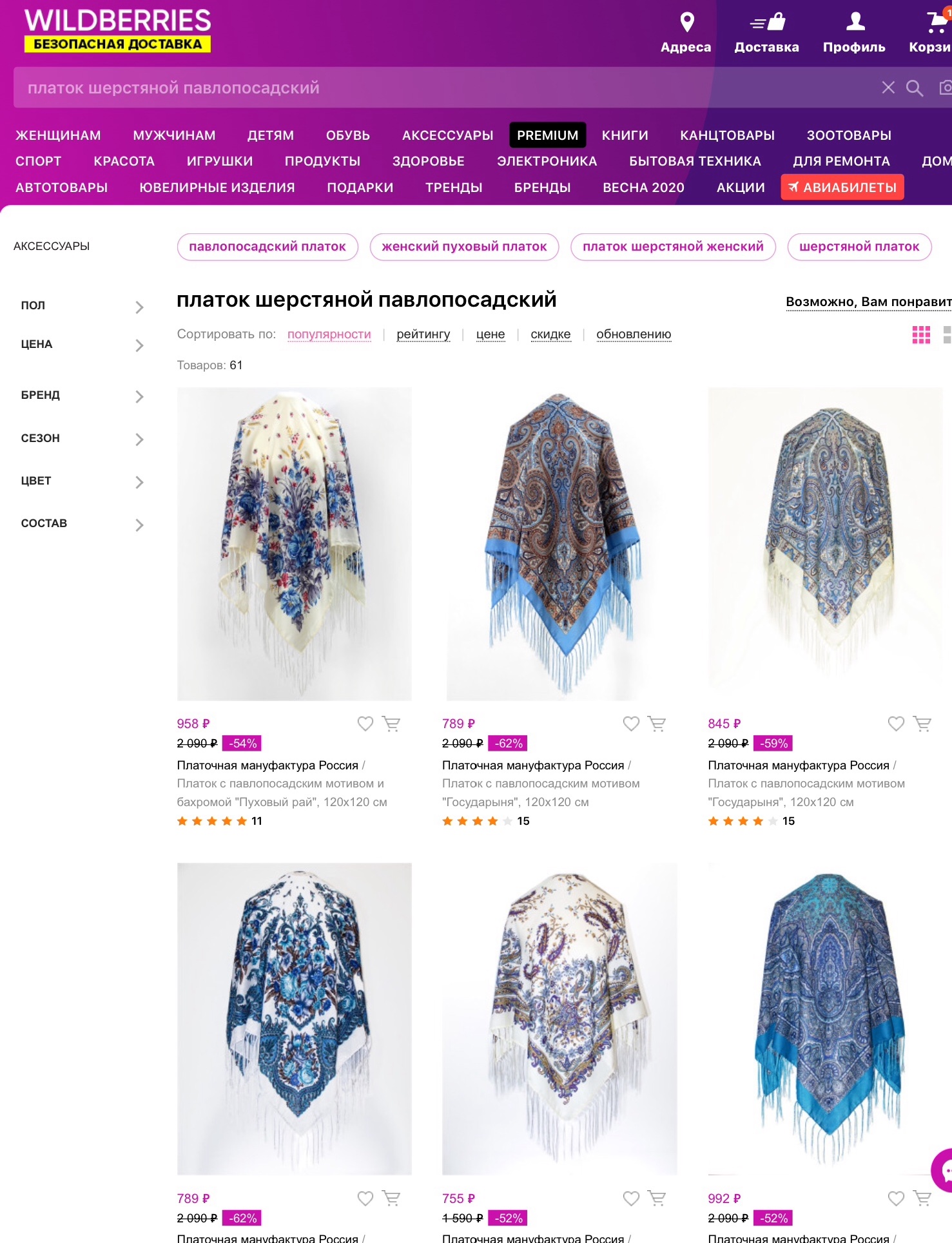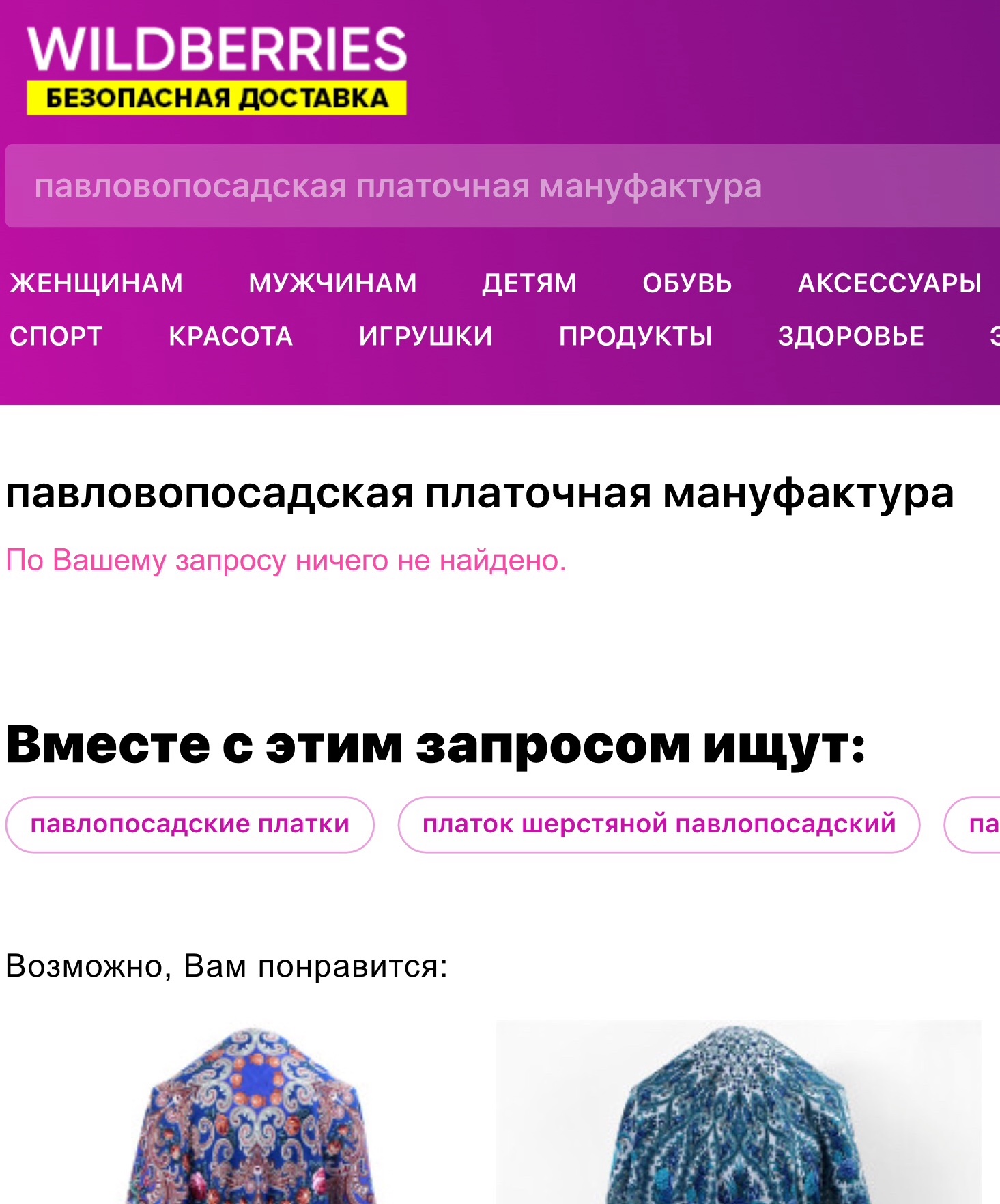 Да я думаю, что знаю, как наши платки называются и как пишется Павловопосадский, но WB упорно не находит