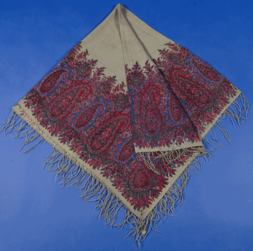 Типичный свадебный платок в подражание т.н. настоящим шалям. Печатная имитация европейских шалей, которые, в свою очередь, копировали настоящие кашмирские шали, вошедшие в моду в XIX веке.