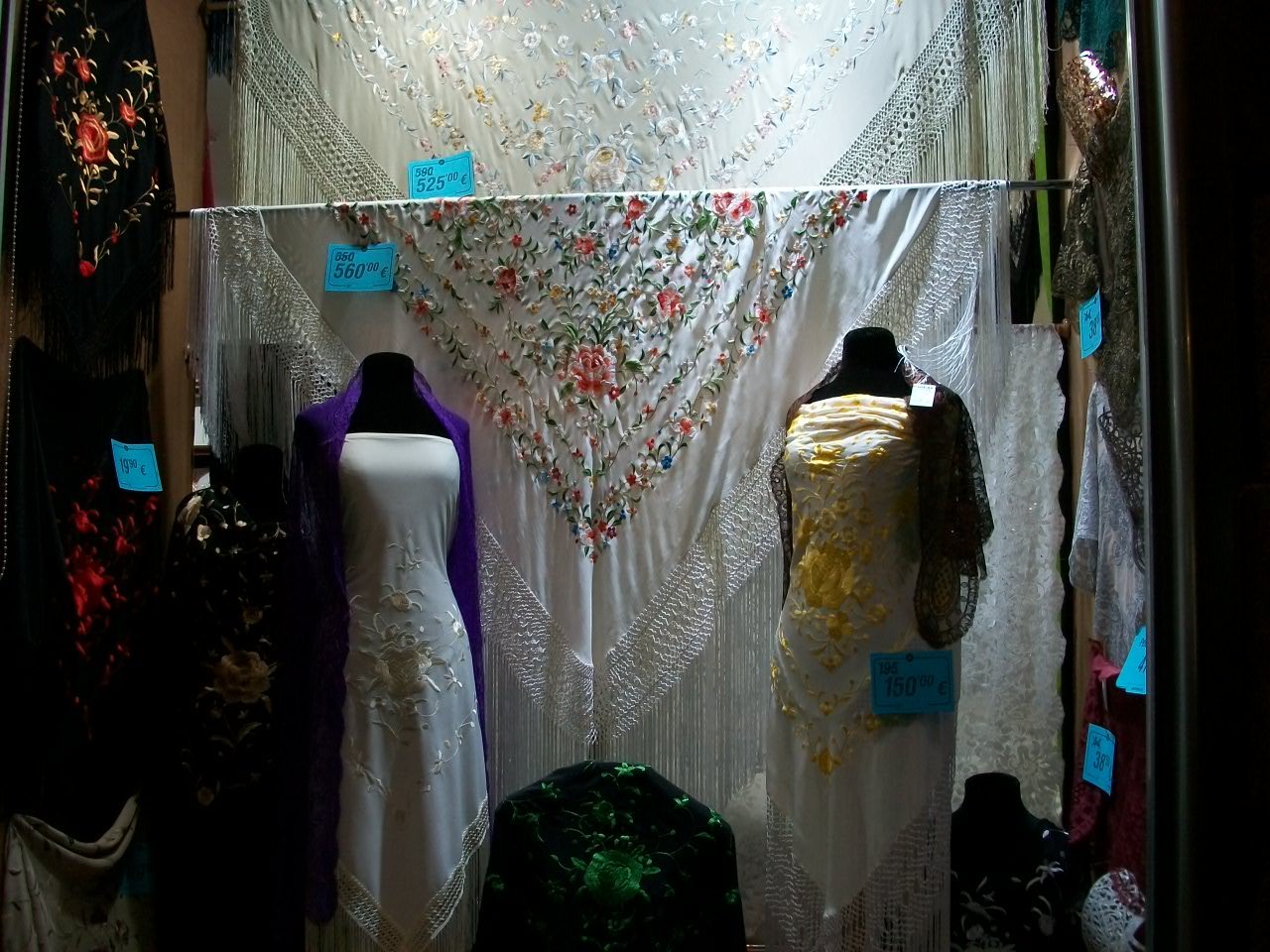 Leonora про цены лучше бы у кого-то из испанских резидентов уточнить. У меня уже давнишняя покупка, года так 2010. Тогда нижний порог мантонов был 150 евро для машинной вышивке на шелковом поле и большом полотне. 25-50-69 евро стоили "сувенирные шали а-ля фламенко стиль, но они на искусственном шелке. В магазинах бывают еще какие-то скидки "последнего экземпляра", "остатки", "старая партия" или чуть меньшие размеры. Моя покупка прошла между 100 и 150 евро, потому что на нее оказалась какая-то скидка. Полистав ссылки на магазины из Севильи, мне показалось, что цены на шали в евро не особо изменились за последние 10 лет. Другой разговор, что при конвертации это превращается в другую сумму сегодня.