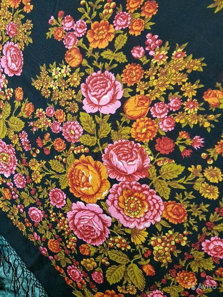 Квадратная шаль из черной тонкой шерстяной саржи с набивным рисунком, имитирующим т.н. настоящие шали из Кашмира. Средник черного цвета с широкой рамкой шириной 45 см по кайме с крупными мотивами мирибота и цветочными гирляндами красного, зеленого, синего и розового цветов. Бахрома из чёрной шерстяной пряжи.