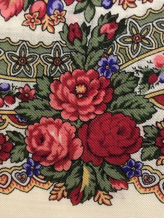 Мне очень понравился платочек Т. Сухаревской. Свежий, сочный, натуральные оттенки! Говорят, что "летний", но думаю и зимой будет актуален. Ткань тонкая. Комфортный, легко драпируется. Шерстяная бахрома утяжеляет немного такую ткань и рисунок--можно переделать на длинную ,"шелковую".