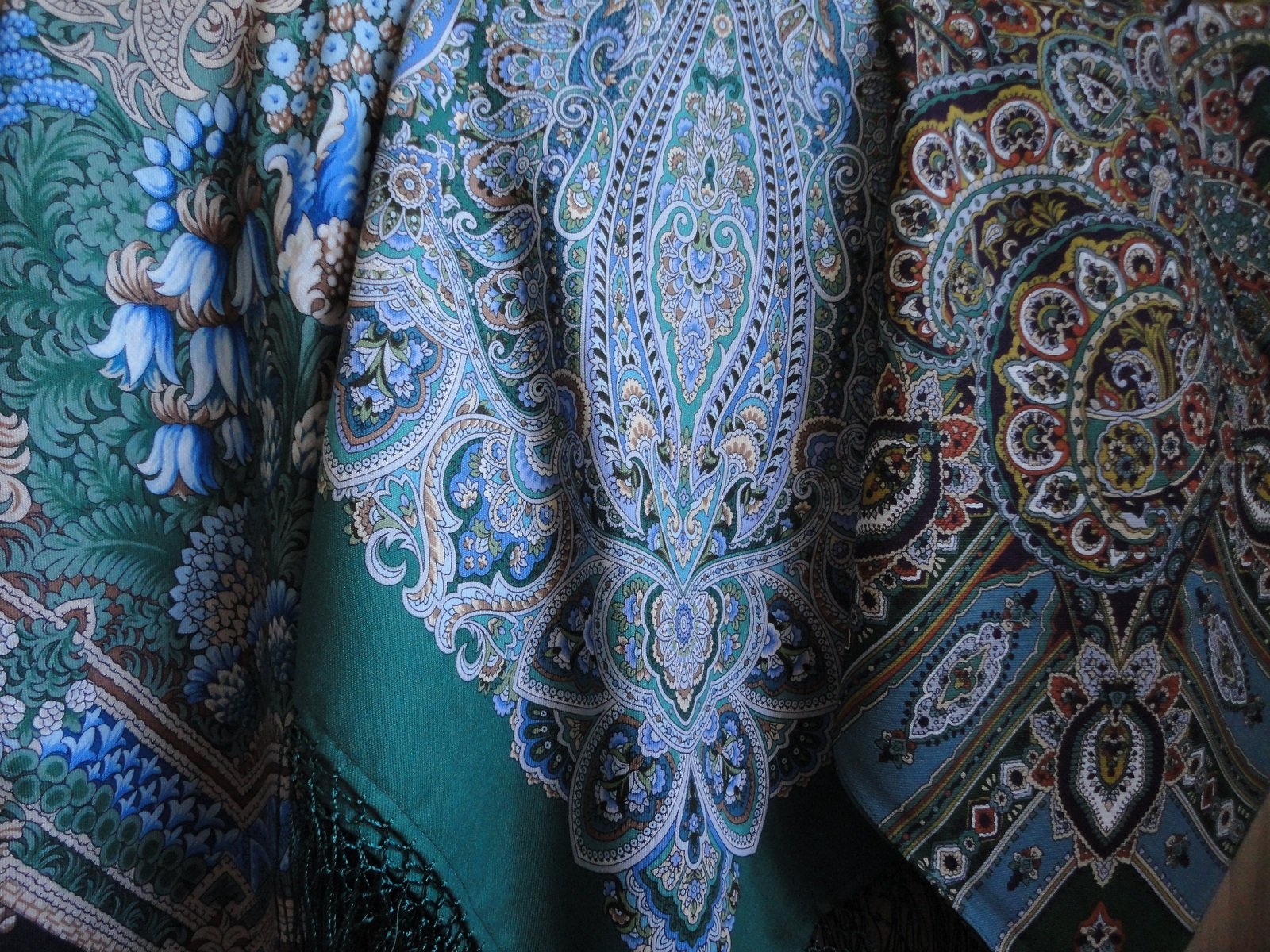 Здравствуйте ! У меня есть этот плат. По цветовой гамме он очень похож на "Бархатная ночь" -30 , а кайма - на листья на нём , только немного звонче , ярче, совсем чуть-чуть. Я бы сказала , что она всё-таки зелёная , но сине-зёлёная. На мой взгляд , цвет морской волны синЕе , но морские волны разные бывают.