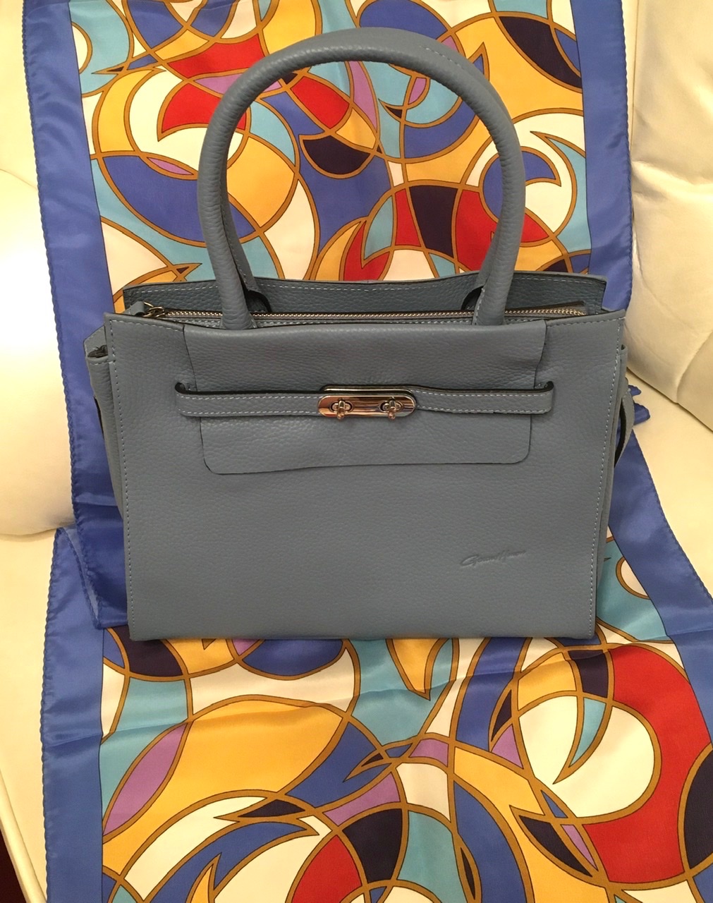 Купила сумочку 3 в 1 в итересном сочетании двух оттенков серого и насыщенной бронзы. Много сочетаний можно с ней придумать. С 2-мя платками спелась сразу.