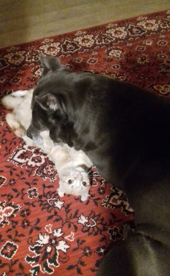 Симба прожил короткую жизнь, но его все очень любили, и даже собака! Борз ему все позволял - сделала скрины с видео, как мелкий кот загрызает корсо