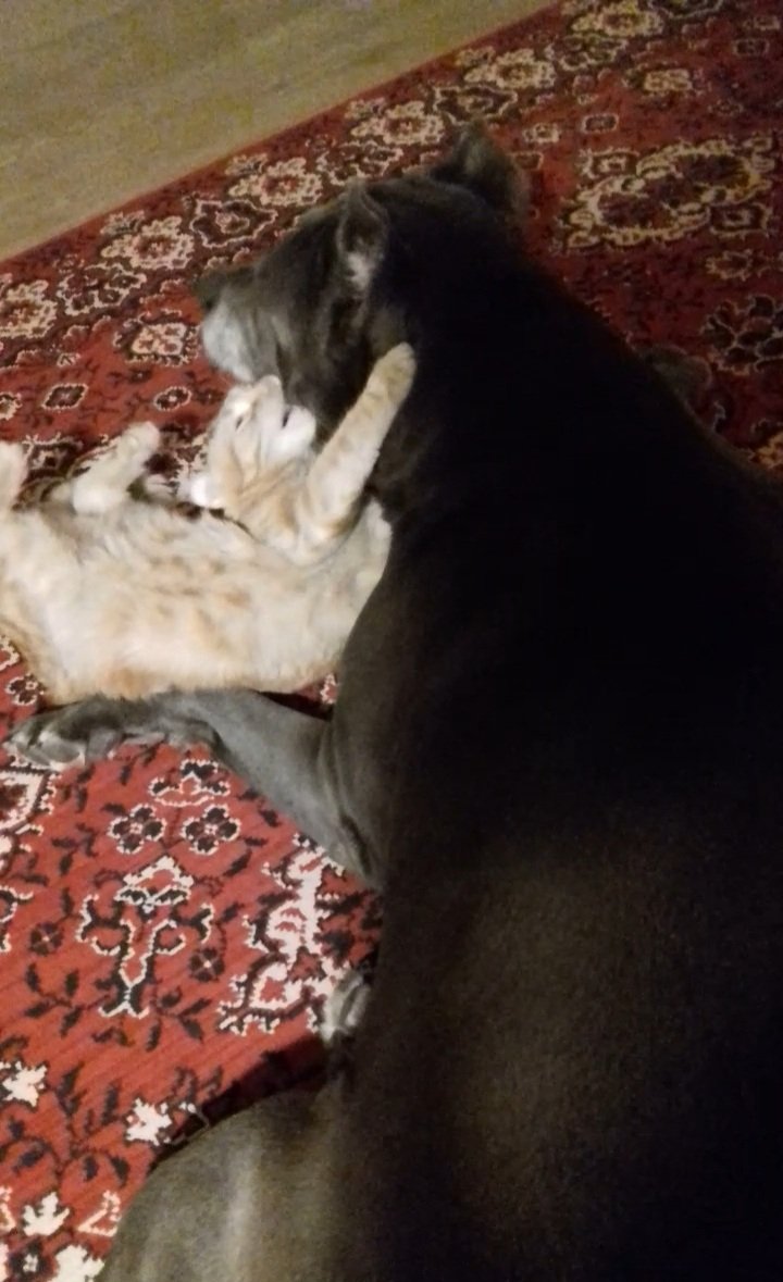 Симба прожил короткую жизнь, но его все очень любили, и даже собака! Борз ему все позволял - сделала скрины с видео, как мелкий кот загрызает корсо