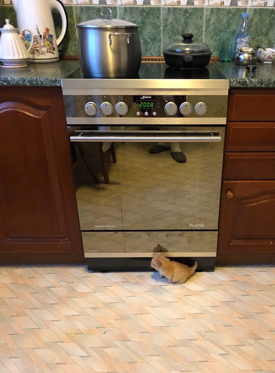 Ходила на даче беременная соседская кошка. Красивая вообще-то. Потом родила. Чтоб ее хозяин не утопил всех котят разом, она их прятала на других участках. Как-то мы увидели что она перетаскивает в зубах котят по одному. Несла она что-то очень рыжее, прямо красное. Попросили соседа чтоб если найдёт, чтоб рыжего, если он ещё и пушистый, оставил бы нам. Так и вышло. Приговорил он всех, а нам оставил. Пришлось за слова отвечать, забрали котёнка себе. Маленький (320 грамм), с лишаем, сам ещё не ел, в туалет ещё приучаем, но уже очень любим. Наш Кузьма.