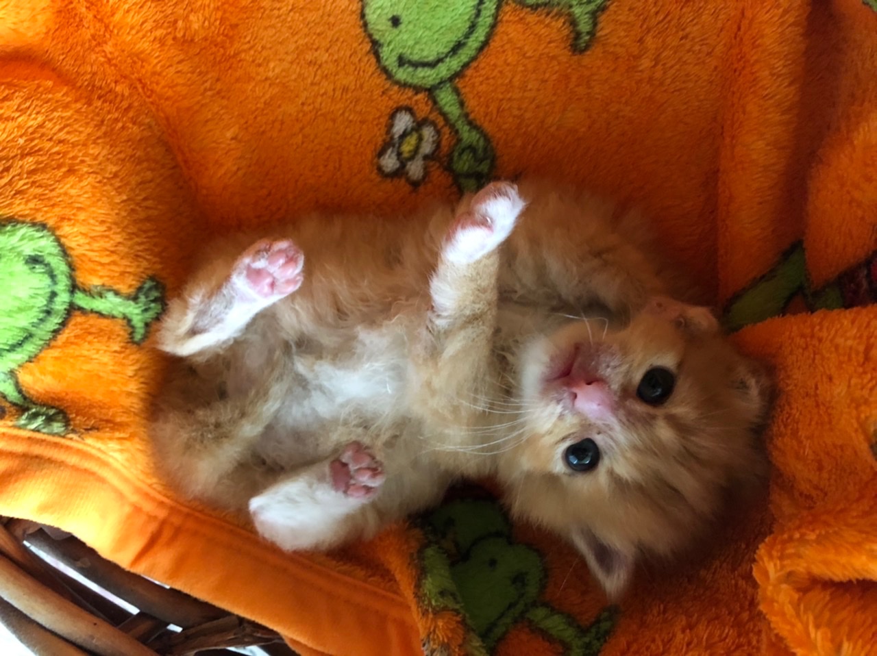Ходила на даче беременная соседская кошка. Красивая вообще-то. Потом родила. Чтоб ее хозяин не утопил всех котят разом, она их прятала на других участках. Как-то мы увидели что она перетаскивает в зубах котят по одному. Несла она что-то очень рыжее, прямо красное. Попросили соседа чтоб если найдёт, чтоб рыжего, если он ещё и пушистый, оставил бы нам. Так и вышло. Приговорил он всех, а нам оставил. Пришлось за слова отвечать, забрали котёнка себе. Маленький (320 грамм), с лишаем, сам ещё не ел, в туалет ещё приучаем, но уже очень любим. Наш Кузьма.