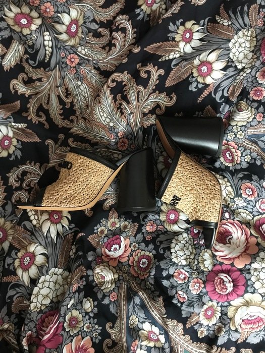 Натуральная кожа отделана соломкой--думать, какие платки подойдут. ( Буду благодарна за рекомендации) Наверное, это вискоза , хлопок, шелк. Сабо закрытые и на прохладную погоду подходят. Покажу в паре с любимейшим "Праздником"-18 (ношу в этом сезоне не снимая).
