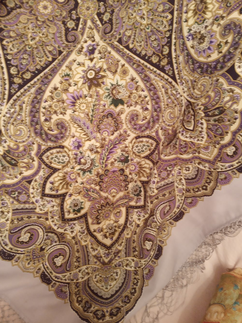Первый платочек купила вискозный Пасьянс 9. Ну очень приятный к телу и не жаркий , но маловат. Сейчас жарко в шерстяных , особенно в магазинах. Напечатайте , пожалуйста , вискозные Арагонский и Фергана . Когда фабрика , конечно , начнет работу. Ещё все Пасьянсы. Спасибо художнику и работникам за такую красоту. Вот прям не хватает такого мелкого рисунка и расцветок в 135 вискозных , как Пасьянс . Уважаемая Елена Жукова , нарисуйте , пожалуйста . Хочется что то , как Пасьянс или Рождественский пряник на вискозе 135.