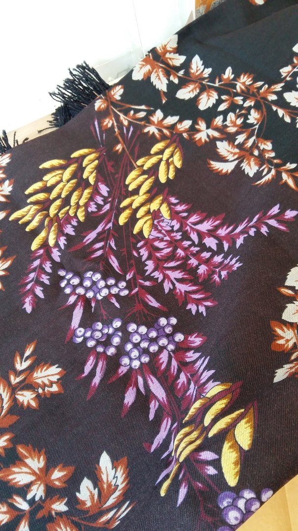 Совершенно согласна с вашим описанием. И фото получилось правдивое, спасибо. На моих фотографиях, которые я приводила выше, фотоаппарат сделал веточки более яркими, и сам платок получился более эффектным, чем в жизни. На самом деле, 27-я Рябина, действительно мрачная. Я в принципе такое люблю и ношу, но, вот реально, Рябина 27 заставляет как-то особо обыграть эту мрачность, что бы всё это выглядело эффектно.