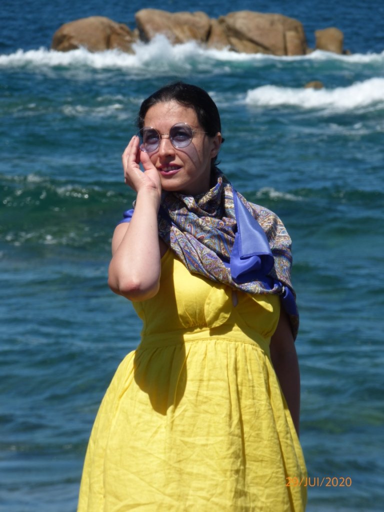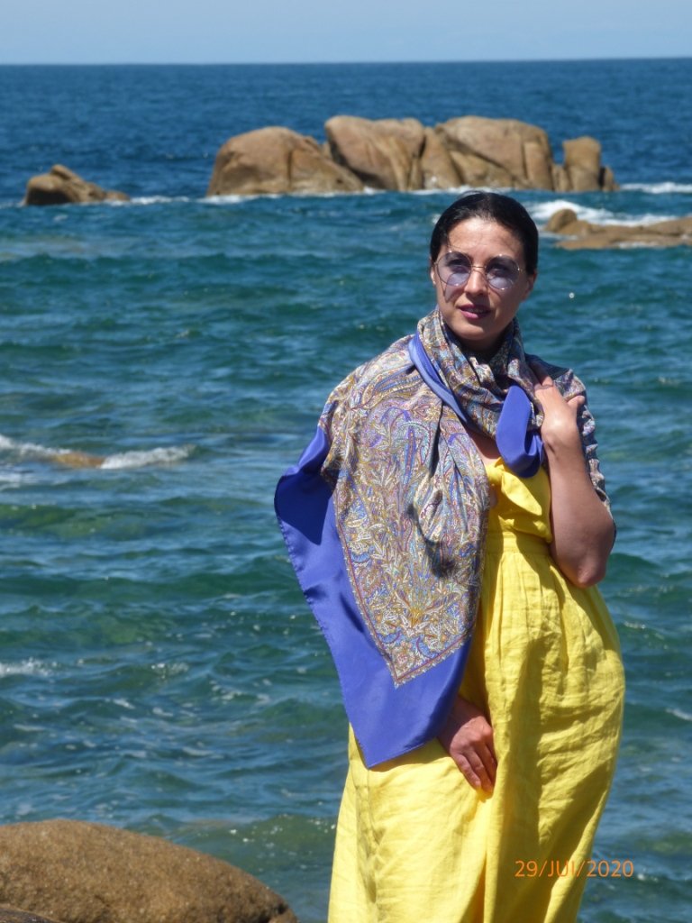 Мангово-дынная Аза прекрасна, у меня ещё уж на какой-то больно тонкой уплотнёнке (Кликните, чтобы почитать, что спрятано под катом)..., что при прохладном ветерочке в самый раз для лета. (Кликните, чтобы почитать, что спрятано под катом)... Праздник очень красив! У меня этот праздник на очень плотном шёлке и бахрома такая классная! тьфу, тьфу, тьфу, чтоб не сглазить:) Несмотря на частое ношение именно у моря, она в отличном состоянии. Может и удастся сохранить, нравится её хамелеонистость множества оттенков фиалкового цвета. Брюки у меня не белые, а светло бежевые, очень тёплого тона. Почему-то, казалось, что с белым будет некоторая резкость. Думаю, попробую и с белым, есть в наличии белый холодный и тёплый цвета слоновой кости.