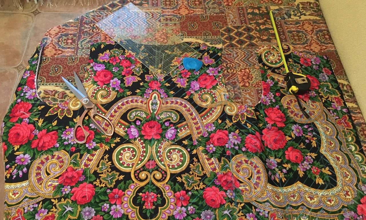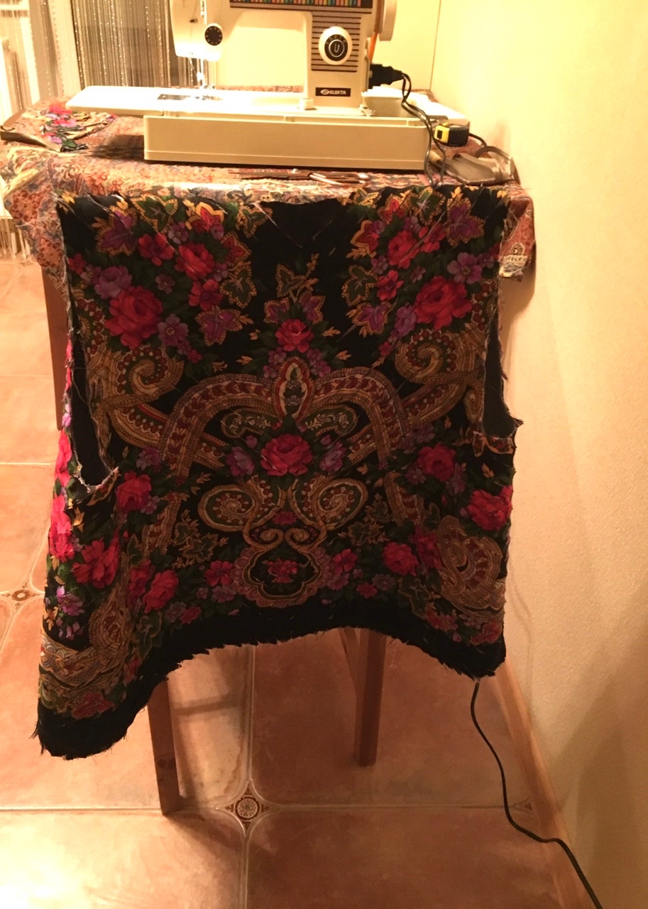 Там 4 слоя ткани, платок сверху. На мои параметры я взяла ровно половину платка Серенада 125х125 см. Ещё одна половина осталась.
