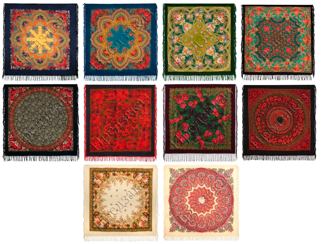 Первая - это те платки, которые мне были понятны и необходимы в момент прихода к платочному увлечению. Тогда мне были очень нужны энергия, радость, тонус. И эту жажду утоляли платки яркие, традиционные, с крупным рисунком и особенно с бирюзовыми и красными оттенками. Эта любовь меня не покинула и сейчас, поэтому мне сразу стало ясно, что «Полдень», «В сто сорок солнц закат пылал», «Приз», «Царевна-лягушка» – это я беру обязательно).