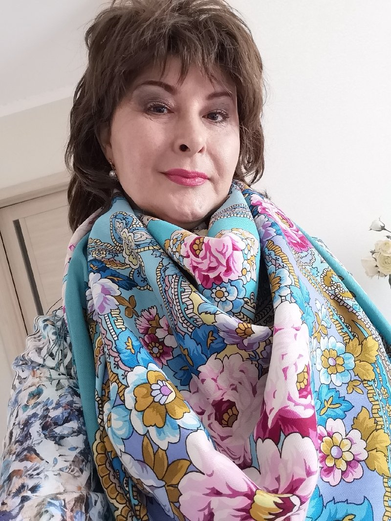 С пылу с жару, без подготовки, распечатала посылку и шаль на плечах. Вот она такая шаль Златы Ольшевской, 'Времена года' Зима, вид 12. Мне очень понравилась и цвет, и ткань мягкая, хорошо драпируется.