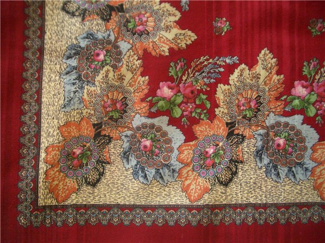 От платка, показанного Mary, отличается, кроме колорита, ещё и тем, что по центру разбросаны не ягодки, а цветочки и двуцветные мячики.