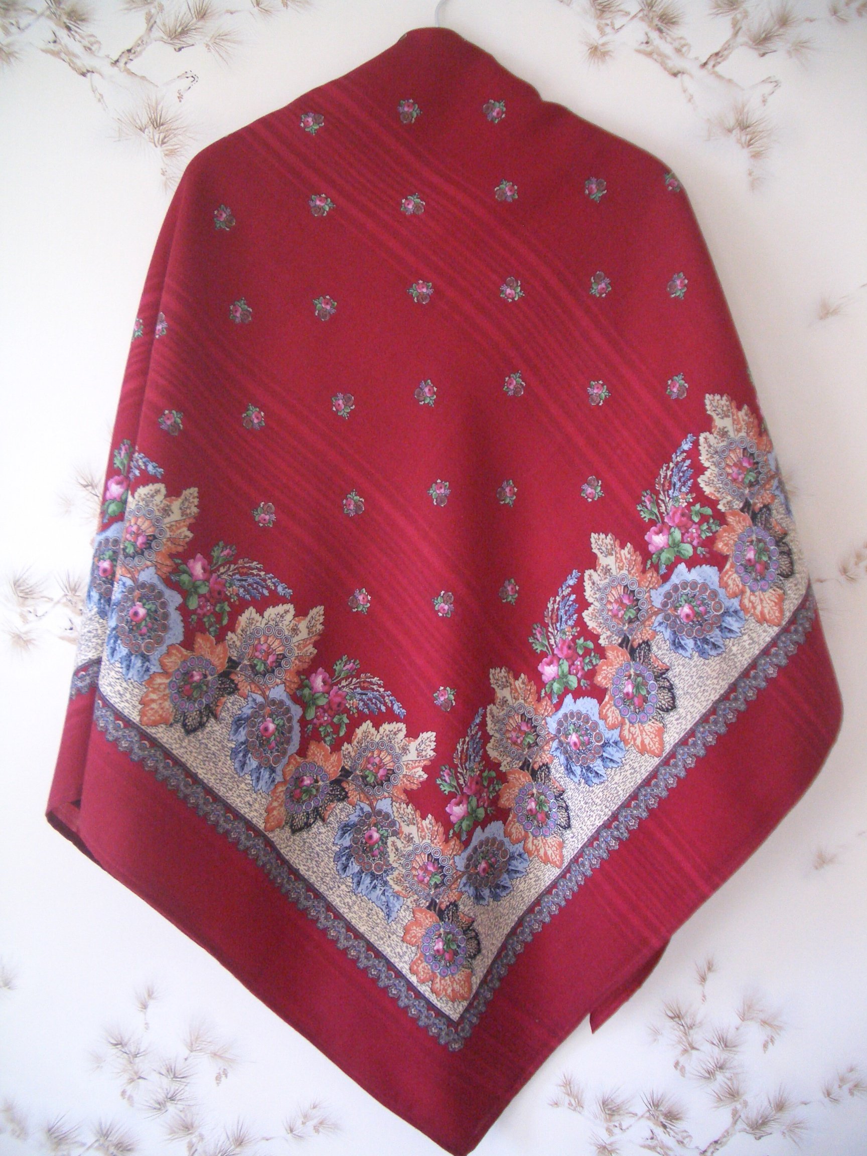 От платка, показанного Mary, отличается, кроме колорита, ещё и тем, что по центру разбросаны не ягодки, а цветочки и двуцветные мячики.