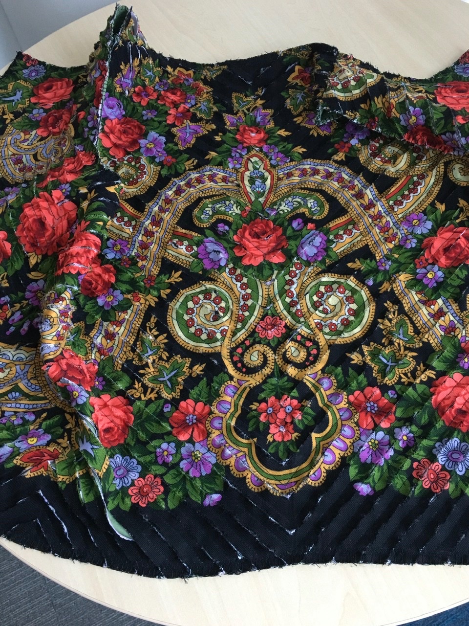 Там 4 слоя ткани, платок сверху. На мои параметры я взяла ровно половину платка Серенада 125х125 см. Ещё одна половина осталась.