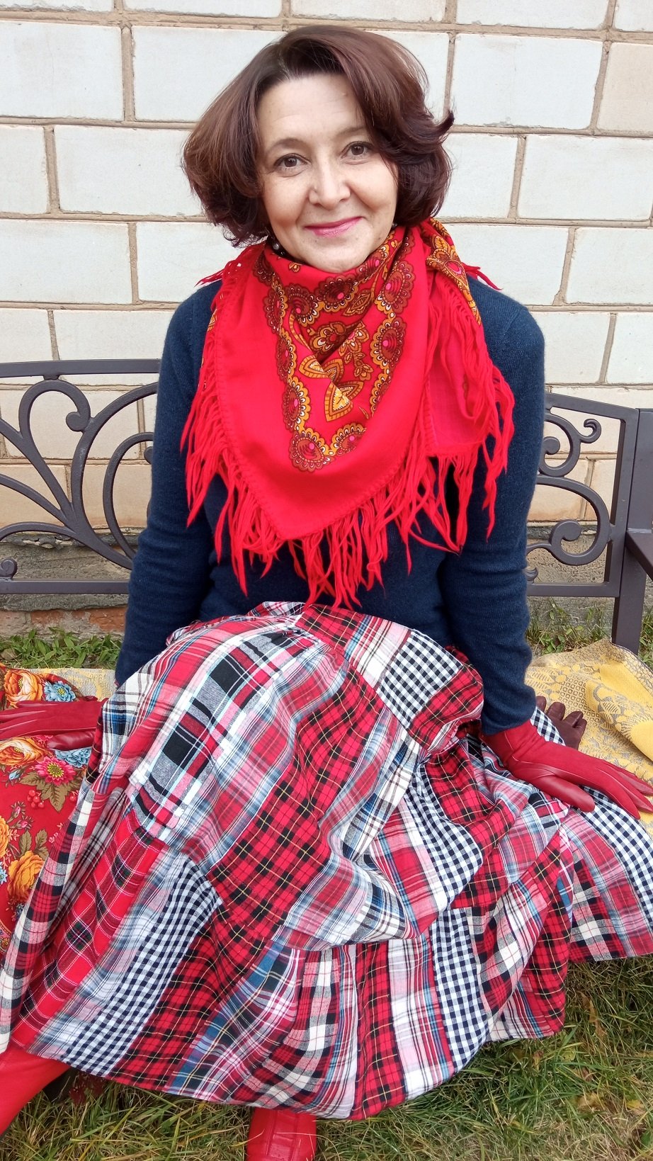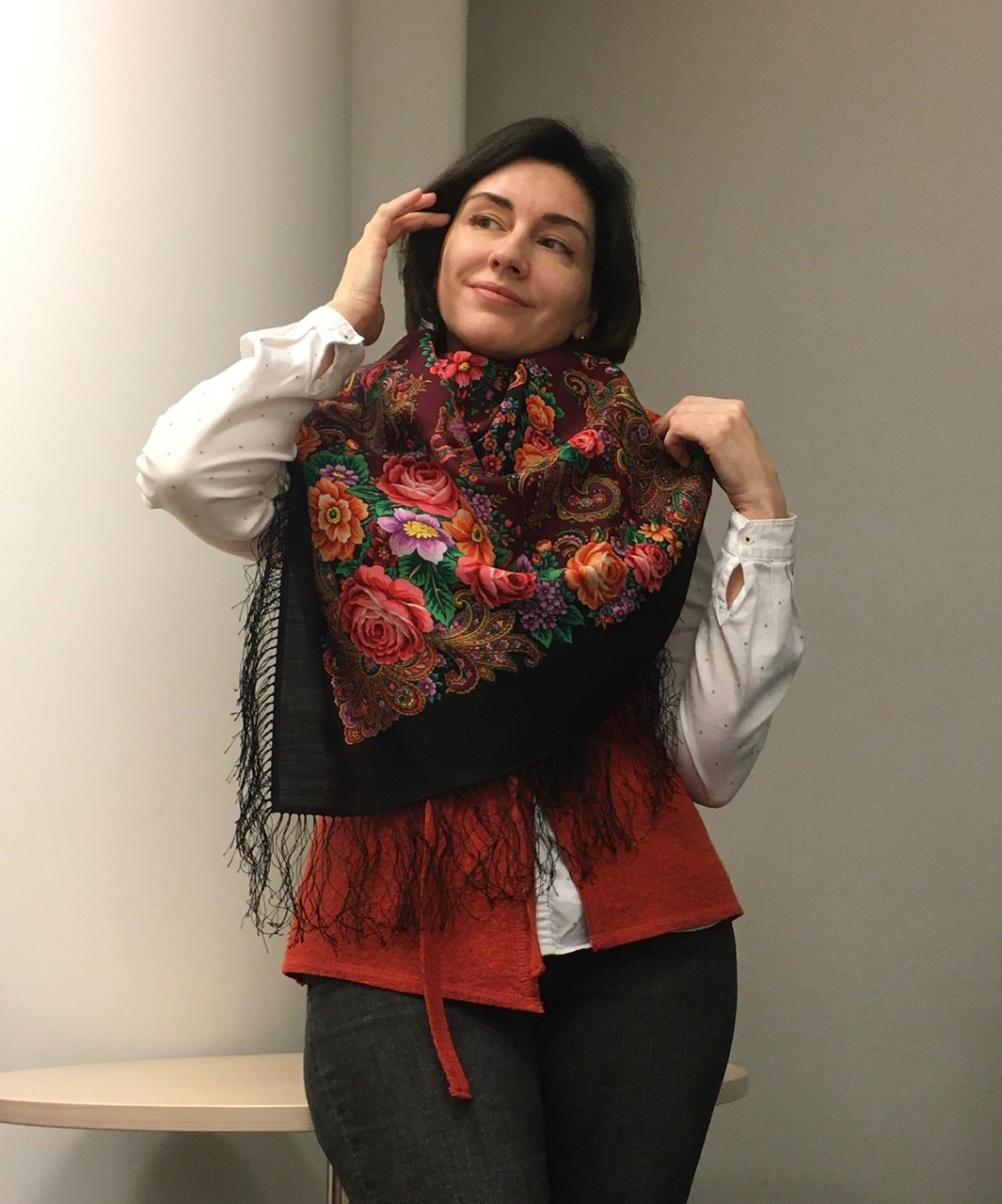 Nathalie, Наташа просто красавица. А цветы особенно красные тебе очень идут. Придают образу твоему игривость и яркость. Ты всегда умеешь подбирать платочки и шали. Всегда образ получается единым, одно перетекает в другое. Ты просто молодец! Спасибо Наташа за показ! ^%