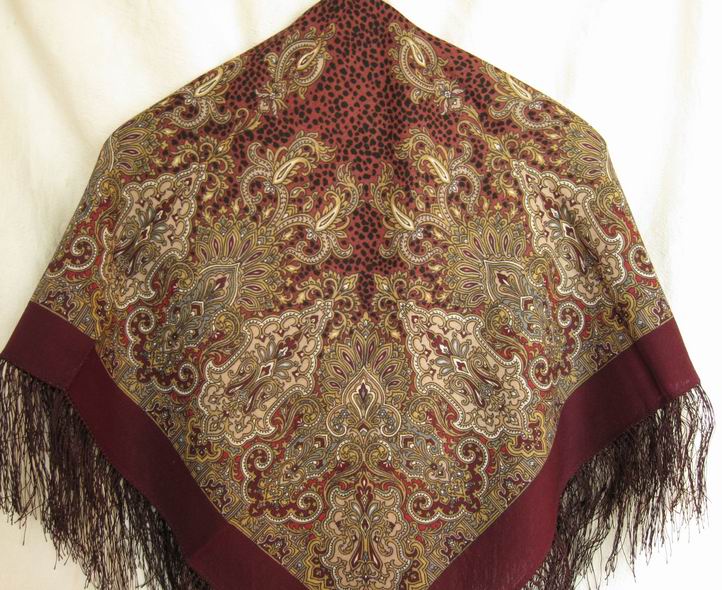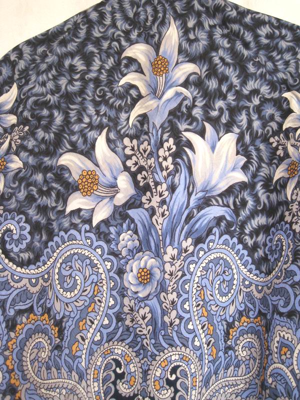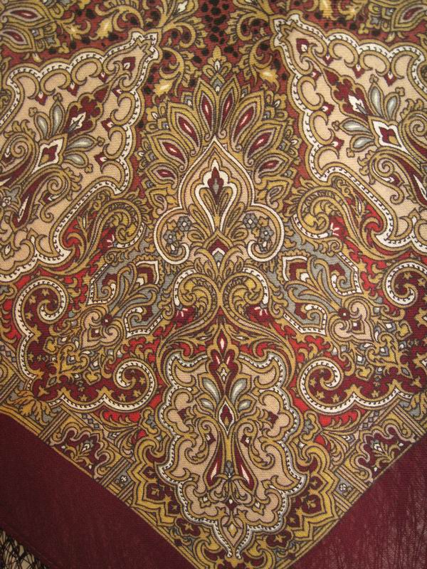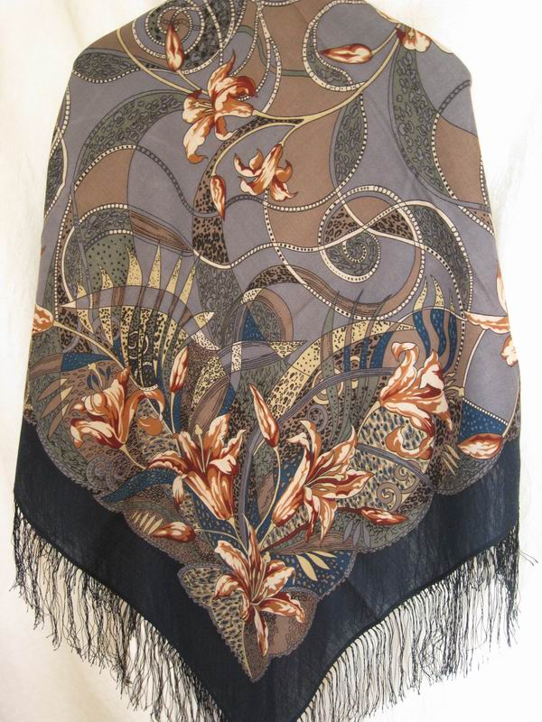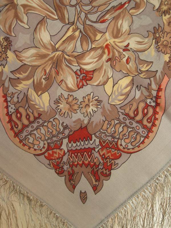 Этот платок "Сады Шираза" (855-7 размер 89х89 шелковая бахрома) еще есть на сайте, в печатном каталоге его нет. У него очень мелкий сложный рисунок, который трудно разглядеть на сайте, а жаль!