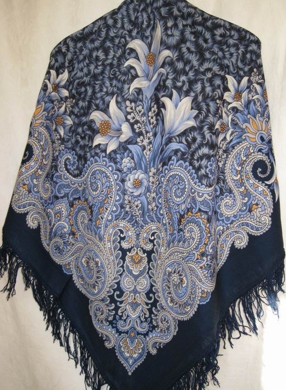 Натик, если вам идет синий цвет, то возможно подойдет шаль Морозко. У нее очень тонкий нежный рисунок. Фон и кайма темно-синие, а рисунок голубой и поэтому шаль выглядит очеь теплой и радостной, вот только шерстяная бахрома ее немного огрубляет. Размер 125х125