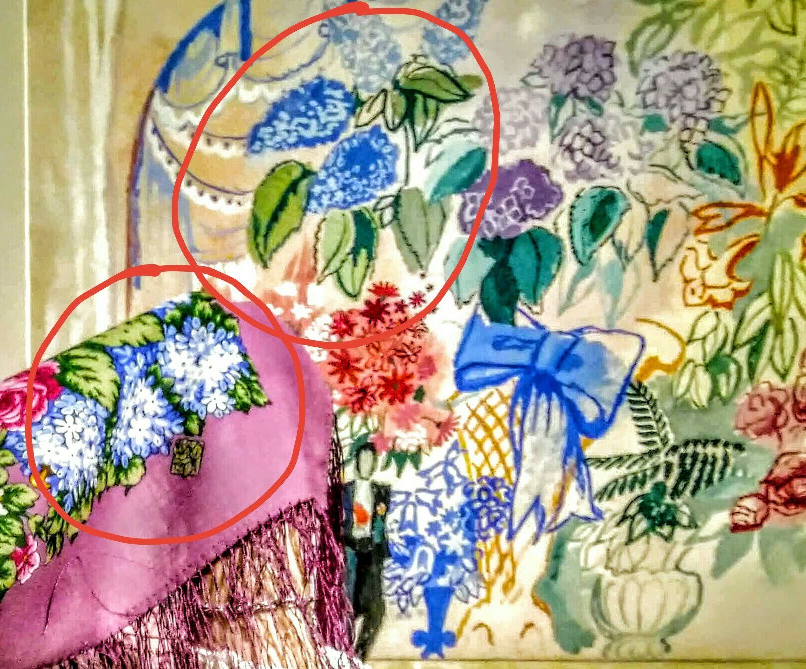 Девочки, тема прелесть! Немного клиническая (в хорошем смысле), поэтому здесь и расскажу. Были на выставке Ю.Анненкова. Около одной акварели - эскиза декорации одного спектакля я прям как споткнулась взглядом - увидела сирень точно такую, как на моем платочке, решила обязательно сфоткать.