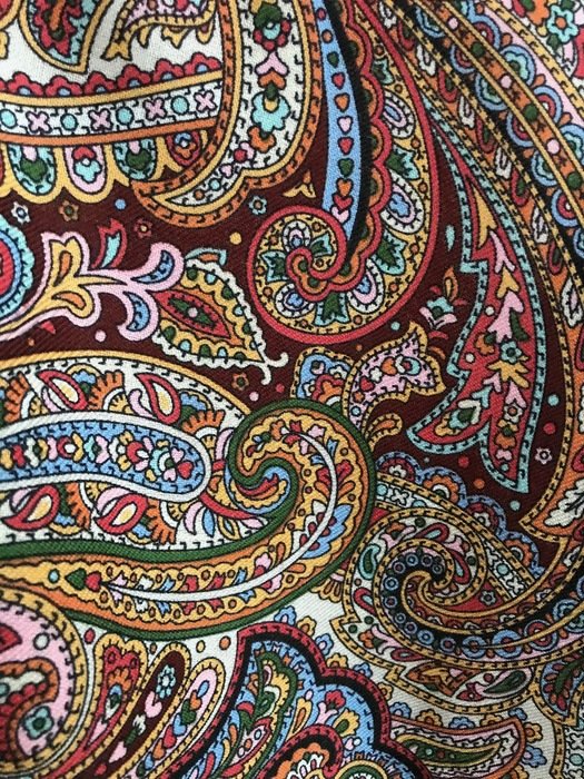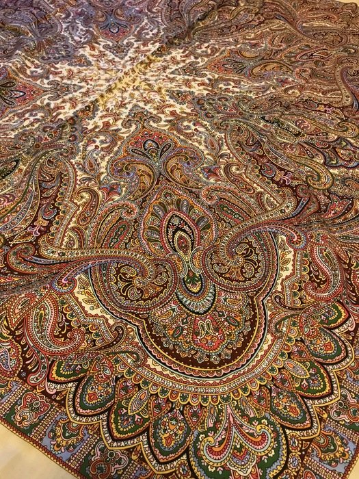 Скажу сразу, что узор очень достойный, не "каша", именно "узор", но на фотографиях выглядит намного красочнее. В действительности не такой яркий. Кайма холодного бежево-серого оттенка. Большого впечатления платок не произвел. Возможно из-за размера: повседневно, куцевато, обыкновенно, простовато, не смотря на красивый рисунок.Не понравилась ткань--мягче, но очень тонкий!