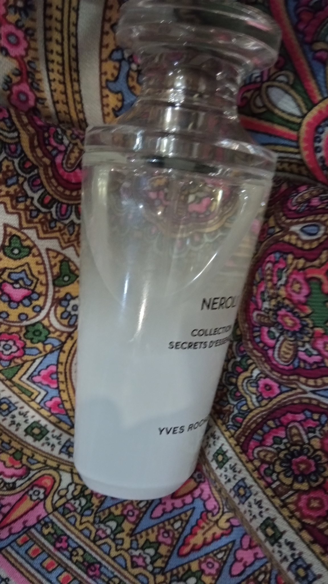 Допишу шажок по сути темы дальше. Пузырек - страшно сказать, но уже 10 летний спутник, переживший не один приступ изменений вкусов, "расхламления" накопленного и банальных переездов. Любим с трепетом и неспешно, глядя на темпы разнашивания - еще лет на 20 моя жажда розы им полностью покрыта. Платочный компаньон к нему совершенно прямолинейный и очевидный, закольцованный хоровод нежно розовых и бежевых роз, цвет важен потому, что это аромат чайной розы, дамасcкой розы и шиповника, она бежево-розовая, с кислинкой и теплым медовым шлейфом. Достаточно летучая, так как ЕдТ. В течение дня можно подновлять или наблюдать, как она улетает от тебя по своим розовым делам.