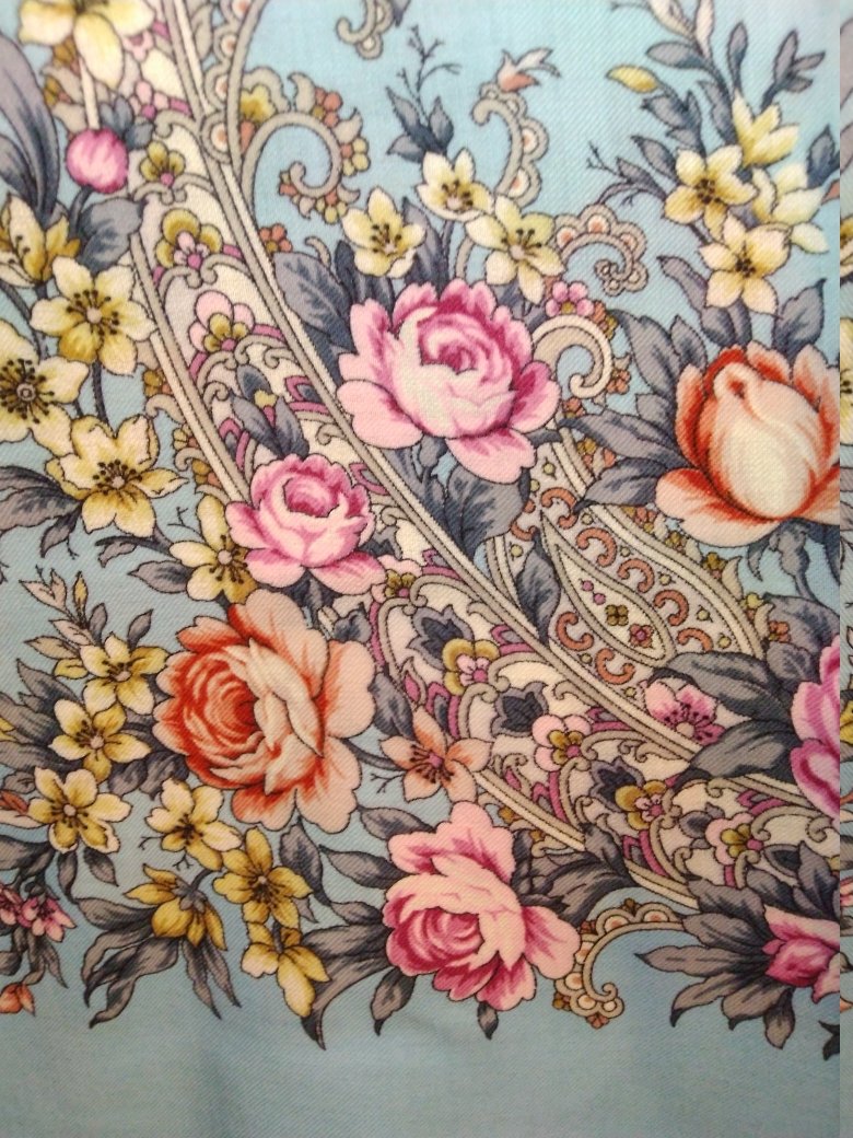 А у Ольшевский весь платок Ковер-самолет разрисован фантазийными цветками.