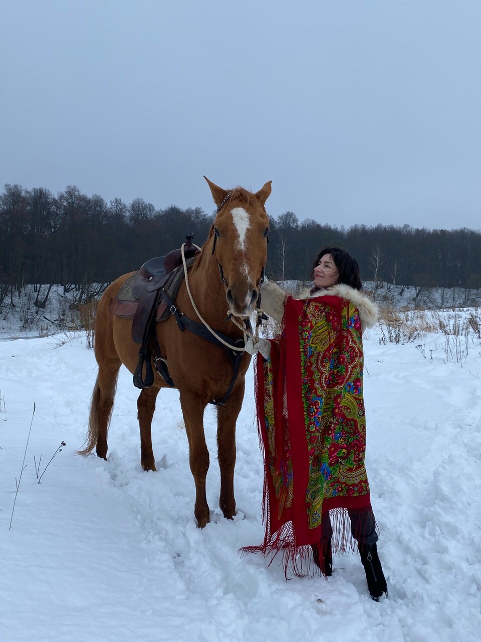 Nathalie, шубы,шали,лощади вам очень идут. Даже не знаю,что больше,видно,вам пойдет и загородный дом с конюшней) "Разводной" созвучен и сюжету и вашей яркой красоте.