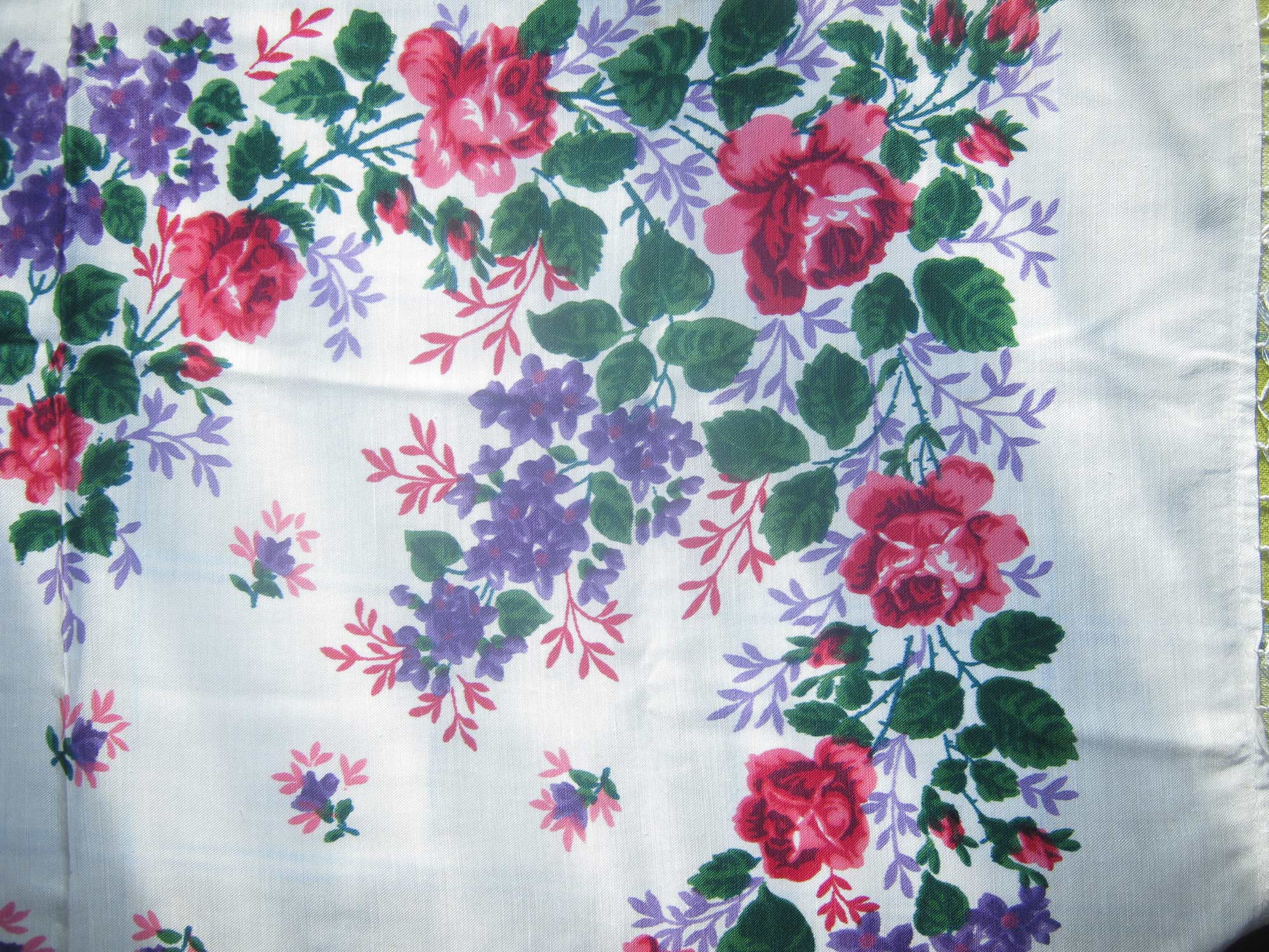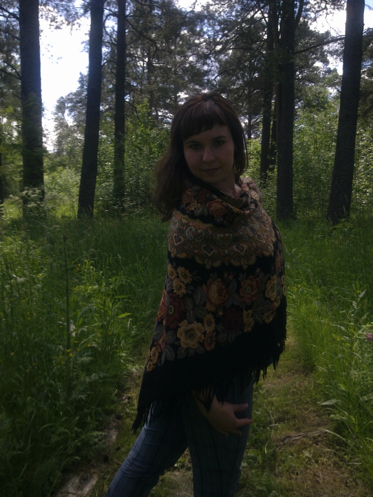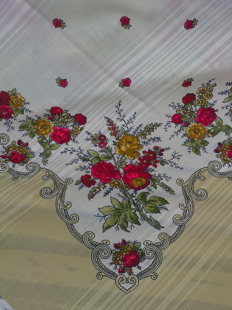 "Уважаемые Знатоки"! Не знаю откуда появилсяв нашей семье вот такой платок. Размер 90х90. Шелковистый, но не шелк. Плетеная шелковая бахрома в два ряда клеток. Бахрома местами повреждена. на платке были какаие-то пятна. Я нашла этот платок, разбирая мамины вещи после ее смерти. Теперь даже не у кого спросить, чей это платок. Может быть,одной из моих бабушек или еще чей? Наша семья родом с Украины, из Хмельницкой области. сколько себя помню, в нашем селе все женьщины носили платки. Да и сейчас носят. Платки сопровождают людей по всей жизни. Ими перевязывают гостей на свадьбе, с ними провожают в последний путь, повязывая на руку всех присутствующих на похоронах. с детства помню, как мама, собираясь в отпуск, покупала х/б Павловские платки. Эти платки хранились у бабушки в сундуке (скрыне) "на смерть", как говорила бабушка. Такие платки показывали на форуме. Мы, дети, очень любили рассматривать платки и шали. Шали, думаю, были очень не дешевые. Поэтом их было не очень много. В основном они были светлые. Сейчас в нашем доме есть несколько больших шалей с шерстяной бахромой клетками. Мне думается, что они мне ровестники. Очевидно стирались, т.к. краски немного поплыли. Фотика сейчас нет под рукой. Покажу их в следующий раз. А сейчас представляю вашему вниманию хлопок о котором писала в начале. Рисунок на платке как будто нарисован акварелью. Красок не много, но они живые и яркие. После стирки ничуть не полиняли. Цвет платка ушел в синеву, а на самом деле он слегка кремовый. Ткань шелковистая и слегка похрусывает, если с усилие провести по ней пальцем. Это может быть Павловсий Посад?
