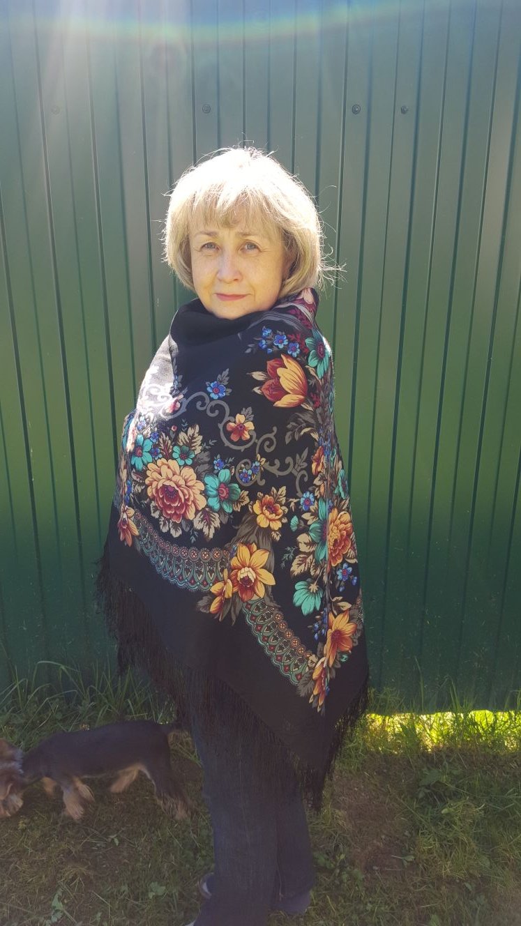 Впервые вижу эту роскошную шаль. На чёрном фоне, эти шикарные цветы и ваш цвет волос - ещё более выделяются, особенно при дневном освещении. Красиво