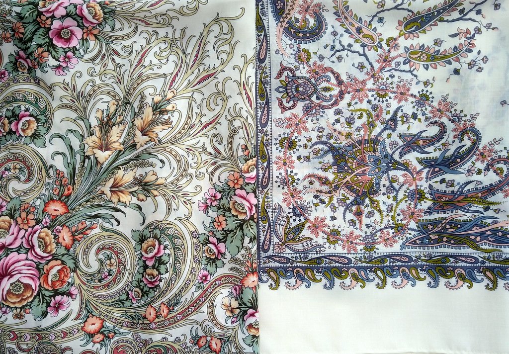 Платок шерстяной с шелковой бахромой "Балаганчик", вид 2, 89x89 см (выпуск 24.12.2020 г.), художник Клара Зиновьева и Платок шерстяной с шелковой бахромой "Март", вид 1, 110х110 см (справа), Платок шерстяной с шелковой бахромой "Март", вид 3, 110х110 см (слева), художник Татьяна Сухаревская.