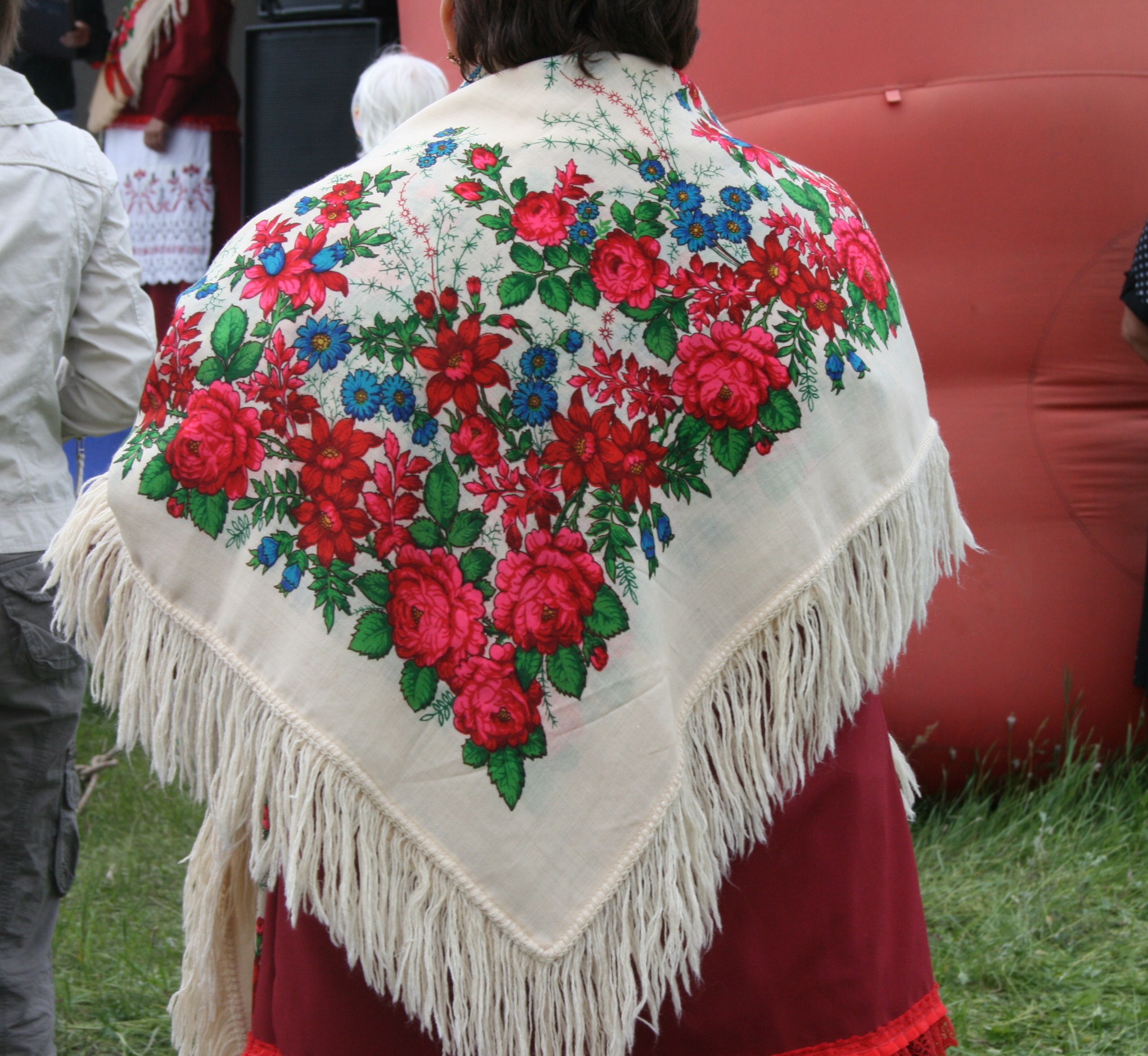 "Уважаемые Знатоки"! Не знаю откуда появилсяв нашей семье вот такой платок. Размер 90х90. Шелковистый, но не шелк. Плетеная шелковая бахрома в два ряда клеток. Бахрома местами повреждена. на платке были какаие-то пятна. Я нашла этот платок, разбирая мамины вещи после ее смерти. Теперь даже не у кого спросить, чей это платок. Может быть,одной из моих бабушек или еще чей? Наша семья родом с Украины, из Хмельницкой области. сколько себя помню, в нашем селе все женьщины носили платки. Да и сейчас носят. Платки сопровождают людей по всей жизни. Ими перевязывают гостей на свадьбе, с ними провожают в последний путь, повязывая на руку всех присутствующих на похоронах. с детства помню, как мама, собираясь в отпуск, покупала х/б Павловские платки. Эти платки хранились у бабушки в сундуке (скрыне) "на смерть", как говорила бабушка. Такие платки показывали на форуме. Мы, дети, очень любили рассматривать платки и шали. Шали, думаю, были очень не дешевые. Поэтом их было не очень много. В основном они были светлые. Сейчас в нашем доме есть несколько больших шалей с шерстяной бахромой клетками. Мне думается, что они мне ровестники. Очевидно стирались, т.к. краски немного поплыли. Фотика сейчас нет под рукой. Покажу их в следующий раз. А сейчас представляю вашему вниманию хлопок о котором писала в начале. Рисунок на платке как будто нарисован акварелью. Красок не много, но они живые и яркие. После стирки ничуть не полиняли. Цвет платка ушел в синеву, а на самом деле он слегка кремовый. Ткань шелковистая и слегка похрусывает, если с усилие провести по ней пальцем. Это может быть Павловсий Посад?