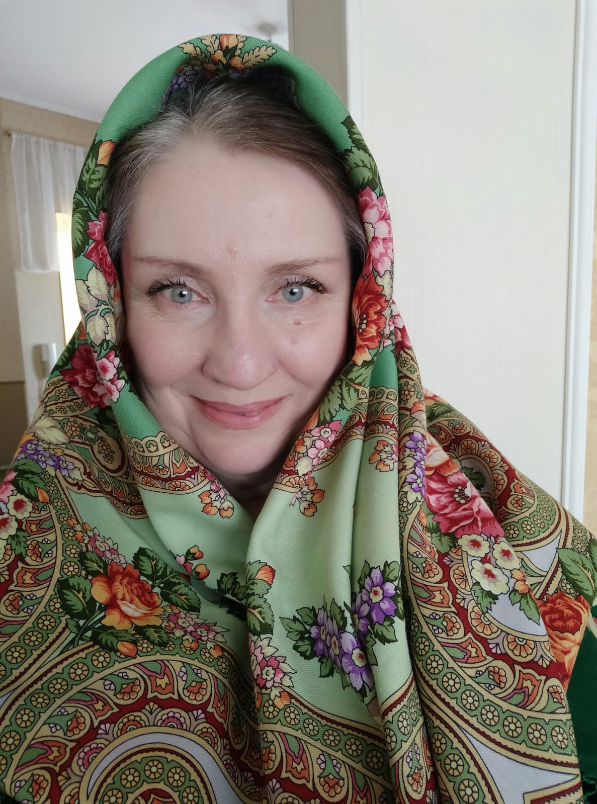 Таня Имбирь, светлые платки для меня -это настоящий праздник, красивые цветы, улыбки, вам здорово в этом колорите!