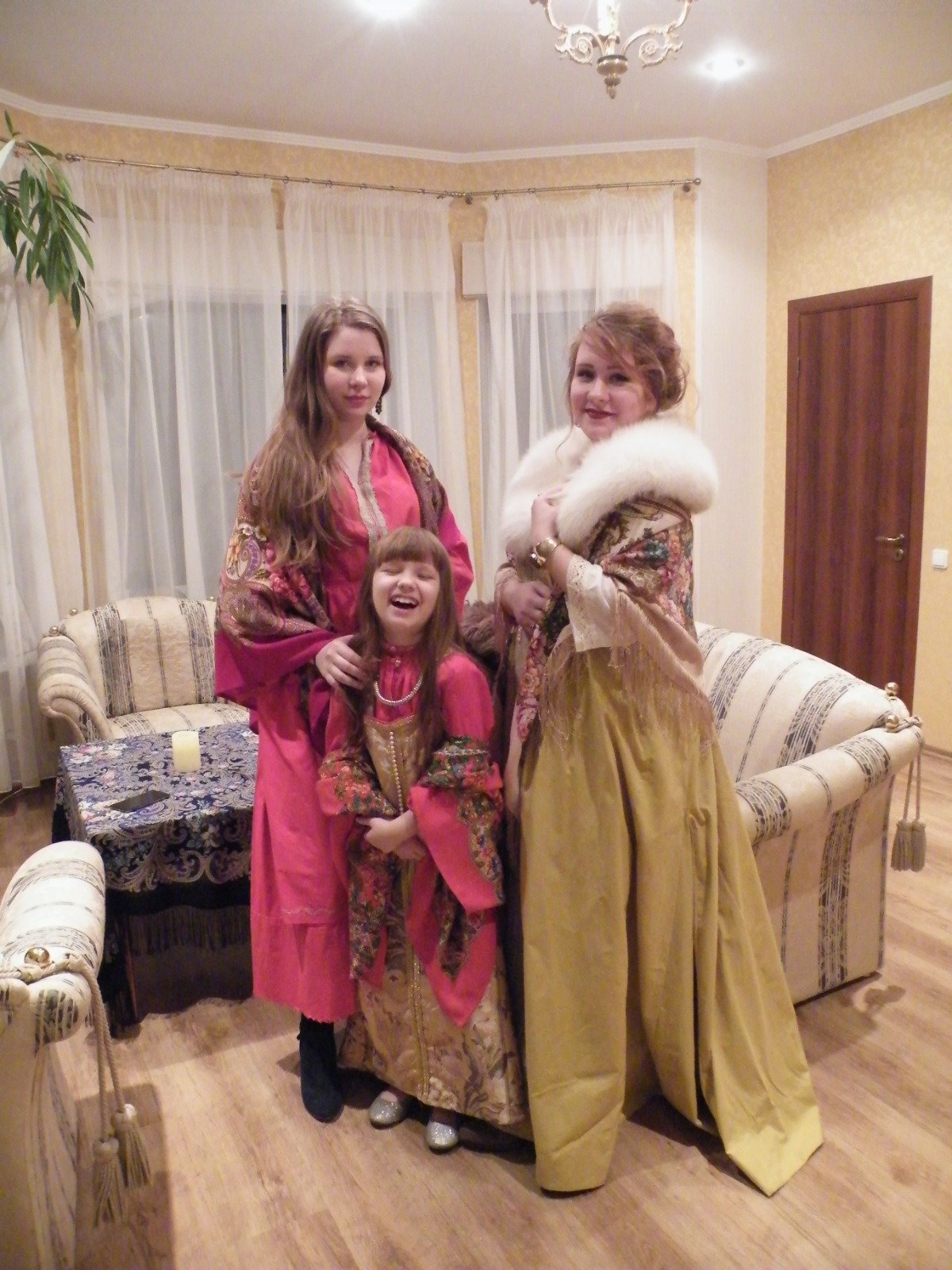 Танюша, я нашла еще фото в том самом желтом косоклине,-он на старшей,на младшей парчовый косоклинчик,на средней,- рубаха на основе сапожковской. Дело было на Масленицу,три года назад,мы вместе собираемся редко(